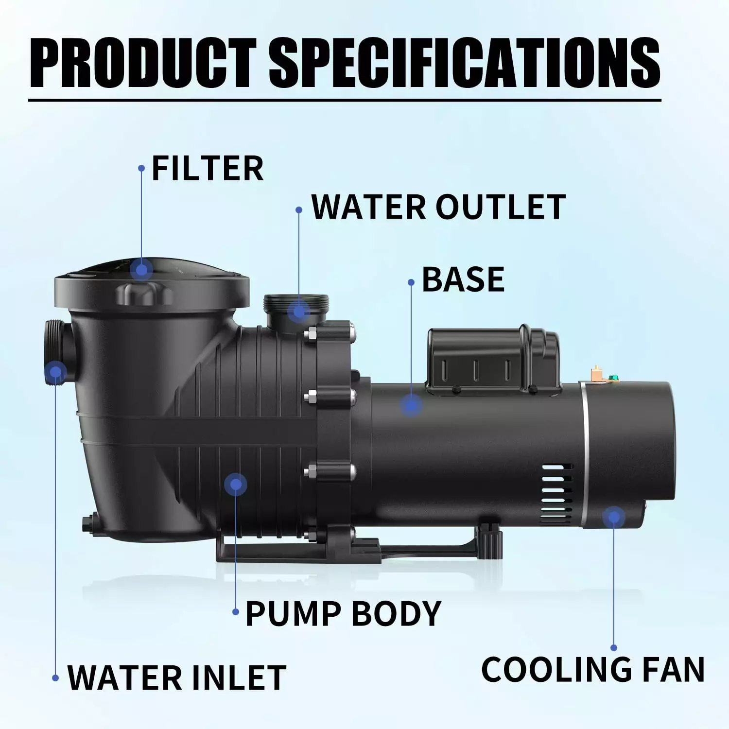 1.5 HP In/Above Ground Swimming Pool Pump. 1150W 4500GPH 115V/230V Dual Voltage Self-Priming Filter Pumps for Pools Spa Bathtub Pool Pump Specification Power 1.5 HP (1120W) Voltage 115V/230V Amps 7.3A/3.5A Speed 3450 RPM Max. Flow Rate 75 GPM Max. Head 42 FT Frequency 60 HZ WEF 4 1.0"&1.2"&1.5" & 2" Inlet/Outlet Dual Voltage Run smoothly either 115 or 230 volts while maintaining the rated output. No matter you run the pump at 115 V or 230 V. it receives same amount of power Strainer Basket Collects debris. leaves. and gravels before they reach the important parts of the drive train Pipe Fittings Supply two 1.5" & 2" PVC pipe fittings and two pipe fittings for 1.5”- 2” hose pipe. Provide smooth and high-quality pipework to keep your backyard swimming pool. inflatable hot tubs or spas as it should Drain Plug Located on the bottom of the housing. Easy for drainage and avoids water accumulation