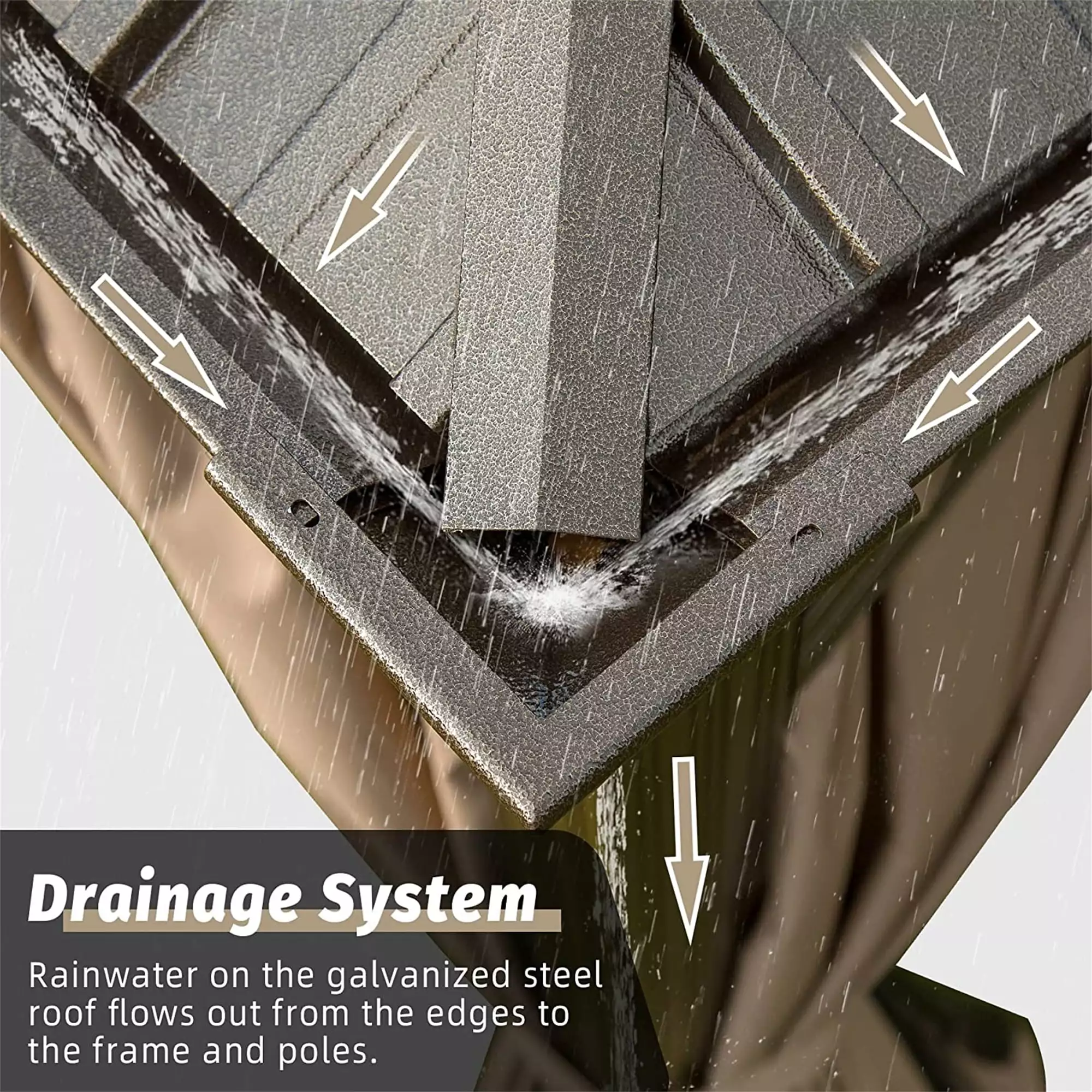 - UNIQUE WATER GUTTER This outdoor gazebo designed with water gutter which allows the rainwater flow from the edge of the top into the hole. then to the ground. No worries about the rainy day and snow melting.