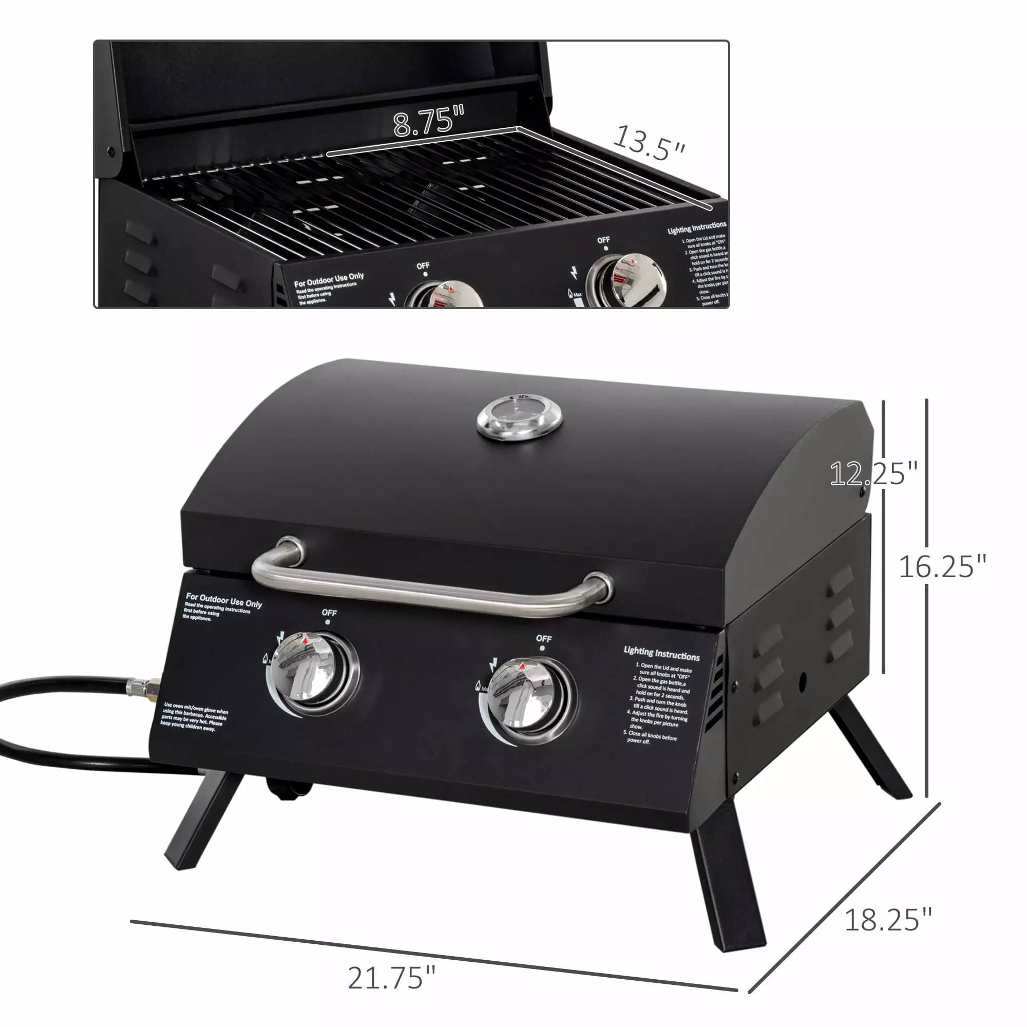 - Double Burners: The large portable propane grill with 2 burners and a wide grill area with two grill grates is ideal for outdoor barbecue parties. Each burner is with piezo ignition. which you can operate separately.