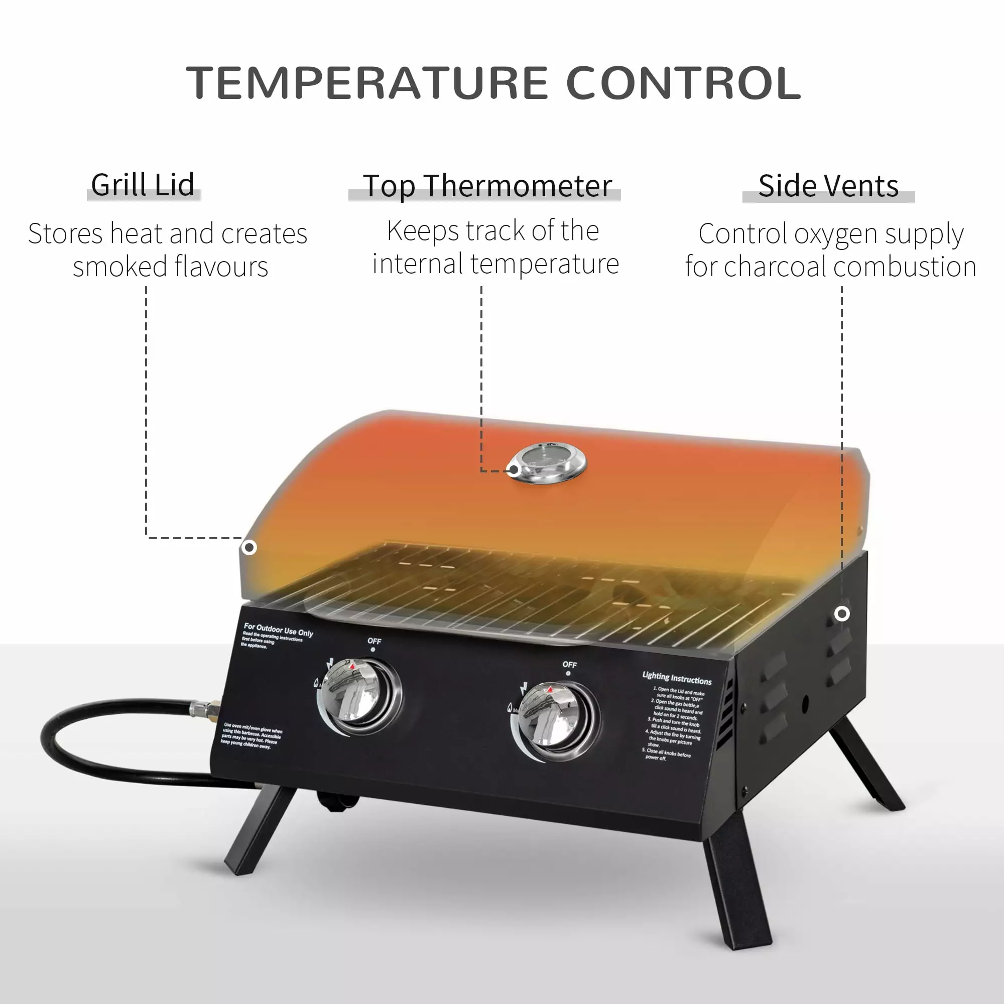 - Convenient Operation: The portable gas grill features a lid that can smoke food simultaneously. An easy-to-read thermometer on the top keeps the internal temperature.