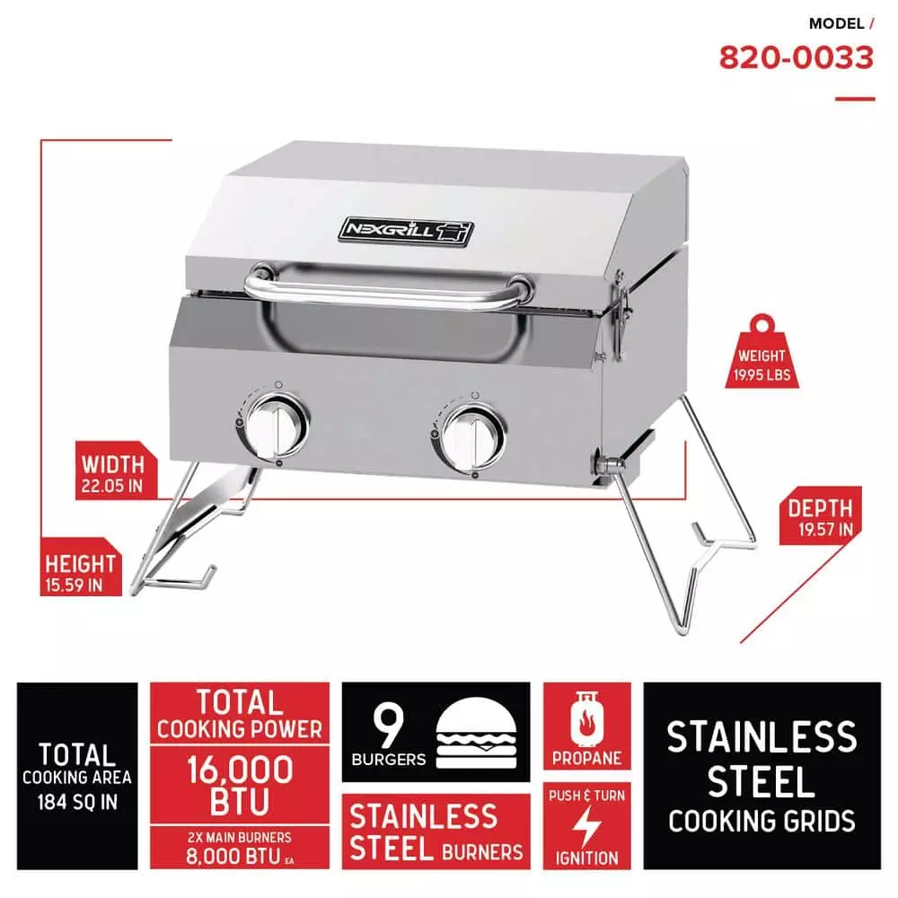The Nexgrill Portable 2-Burner Stainless Steel Tabletop Grill is equipped with two push-and-turn ignition burners for quick and easy start-ups. It offers 16.000 total BTUs and reaches high temperatures quickly with each burner independently adjustable. The stainless steel-wrapped grill grate covers 184 sq. in. to accommodate as many as nine hamburgers at once. The unit connects to a 20 lb. LP tank and can be modified to work with 1 lb. propane cylinders. No batteries or external flame required for ignition. Adapters and propane are sold separately.