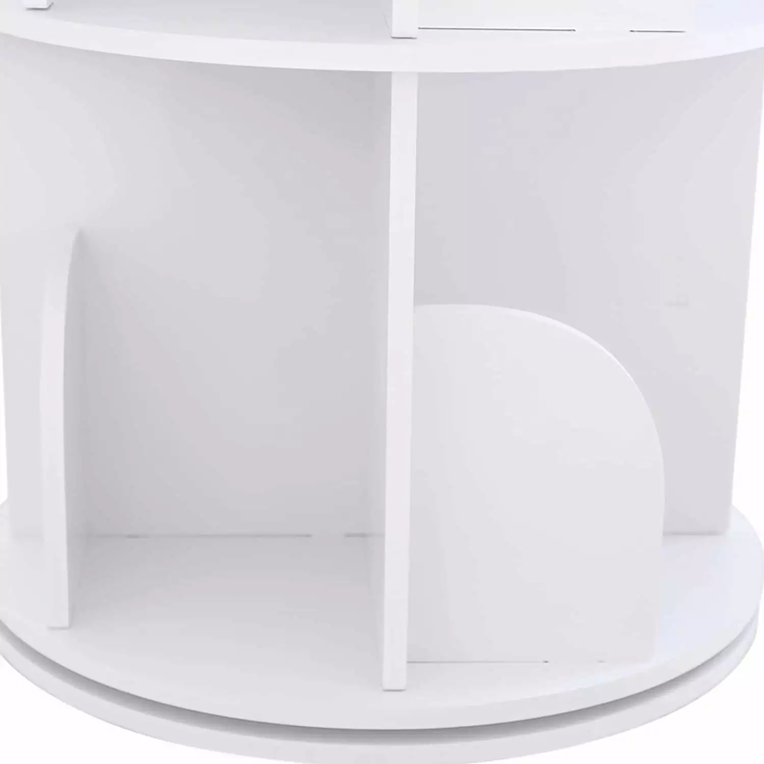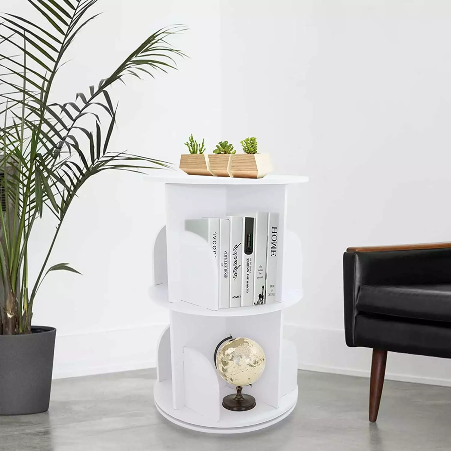 Multi-functionalThis revolving bookcase has 2 tiers with 4 compartments on each tier. which makes full use of every inch of space to store books and other items. The top can also be used to hold potted plants. dolls. flower pots or other items to decorate.