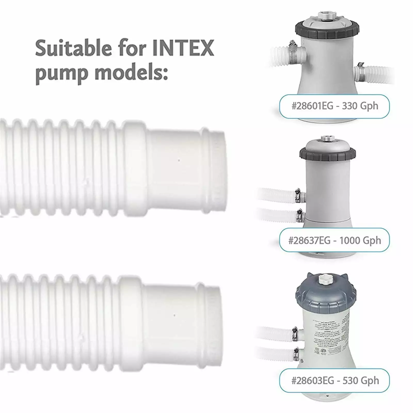 - Versatile Replacement: These pool hoses are designed as replacements for above-ground pools with Intexx 607. 637 pumps or filters rated at 330GPH. 530GPH. or 1000GPH. The length of the water pipe is 1 meter. 39.3 inches. the diameter is 32mm. 1.25 inches