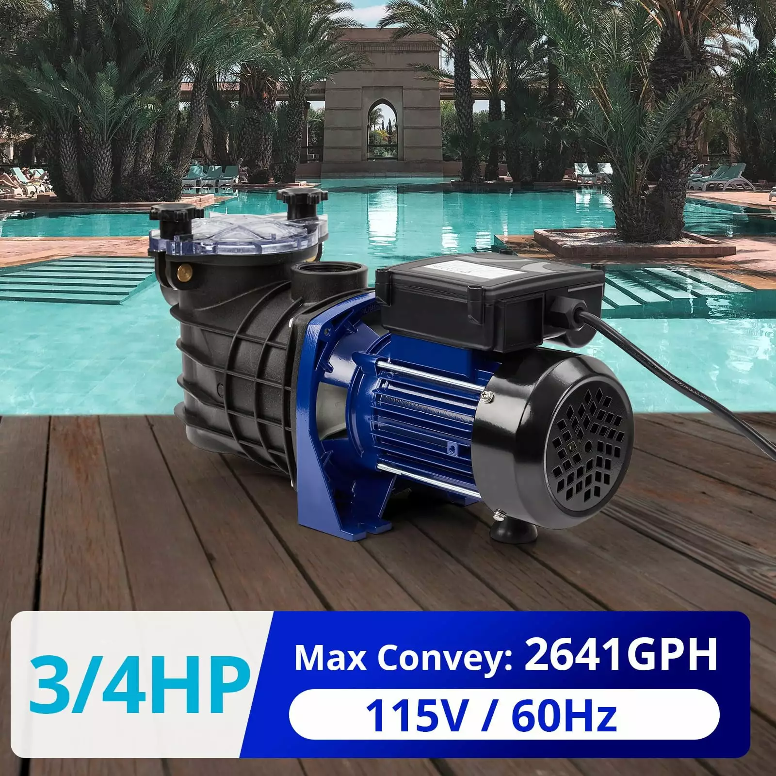 - Efficient Performance 550W 3/4HP pool pump has built-in thermal overload protection and provides pressure and the powerful flow can achieve 2641GPH and the maximum suction height can reach 36ft.