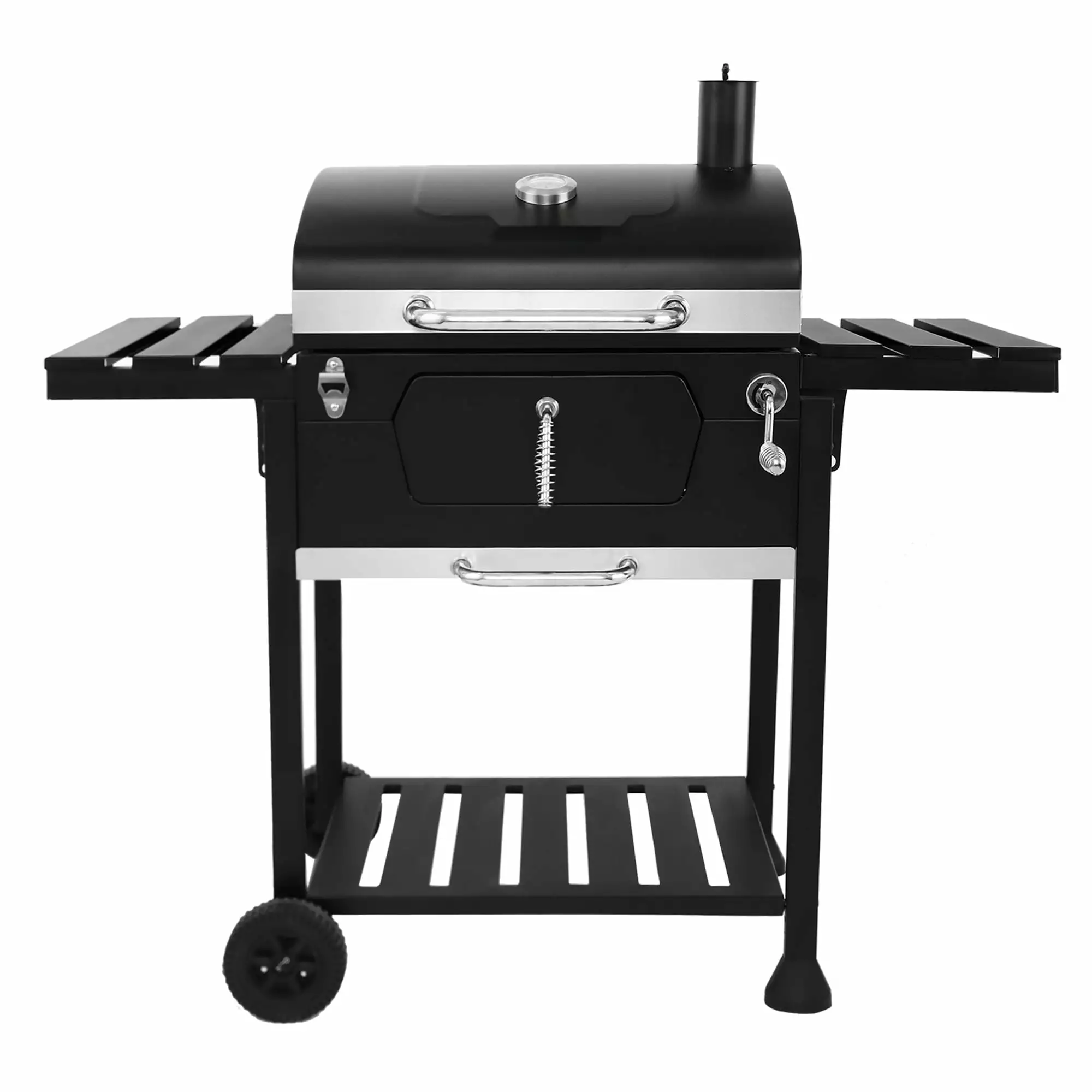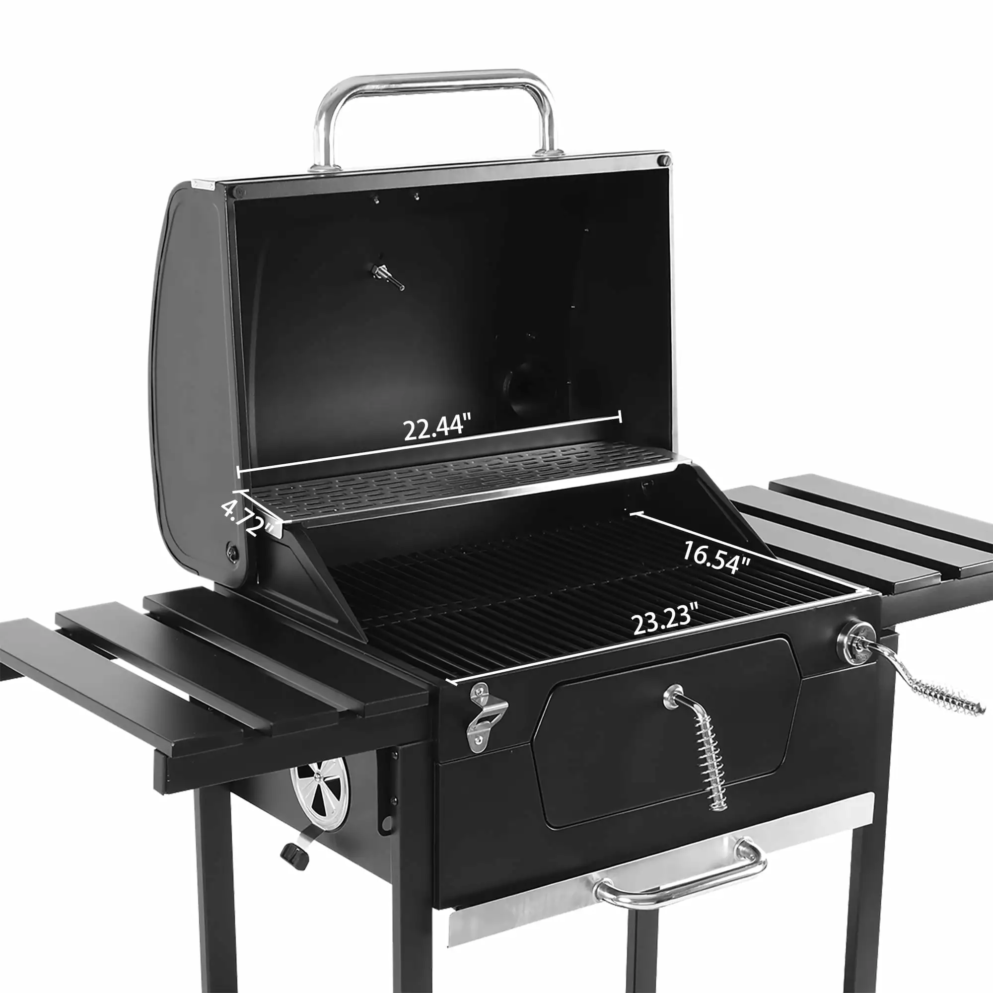Surrounded by savory and delicious aroma. enjoy the ultimate cookout with 24-inch Charcoal Grill. 368 square inches primary cooking area. along with 106 square inches warming rack as a secondary cooking space. serves up to 10 people. perfect for all sorts of outdoor activities from backyard party to camping. The porcelain-enameled cooking grates ensures even heat distribution. Featuring the built-in thermometer and the damper.Height-adjustable charcoal pan helps reach the maximum efficiency in terms of heat utilization. The charcoal access door at the front enables you to add coals or stoke fire with ease. The draw-out ash tray at the bottom facilitates easy cleanup. As for food preparation. the grill has two foldable side tables that can keep your grilling accessories within arm’s reach. In addition. the bottom shelf provides ample storage space. Don’t hesitate. 24-inch Charcoal Grill is the best choice. perfect for cook up a storm.