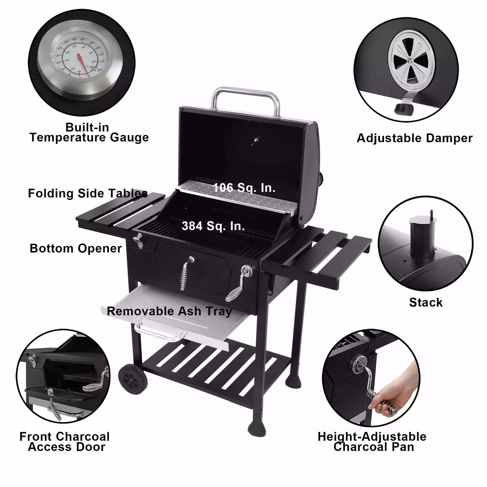 - HEIGHT-ADJUSTABLE CHARCOAL PAN: Height-adjustable charcoal pan. that can fine-tune the temperature during grilling. ensures the best performance.