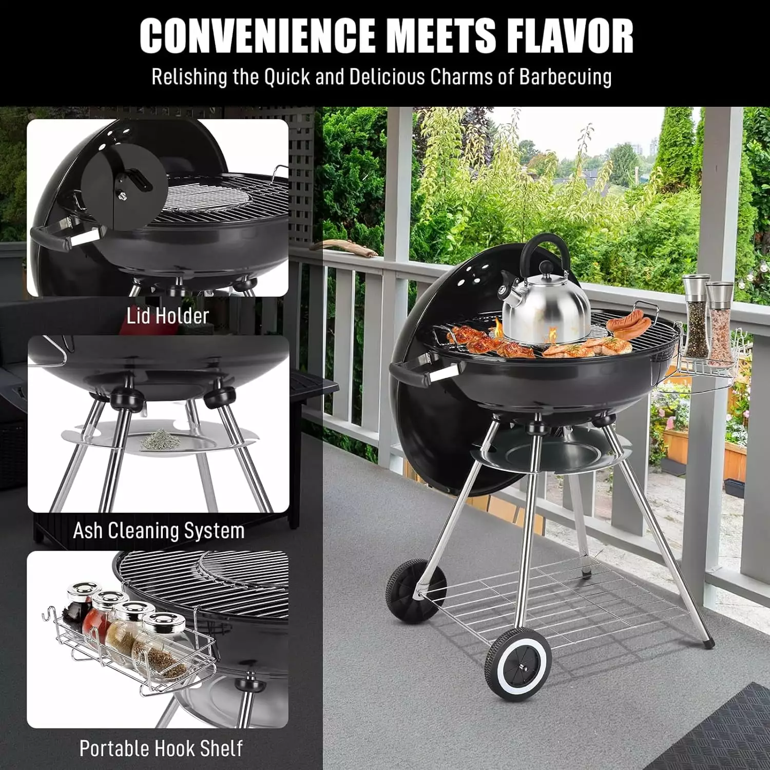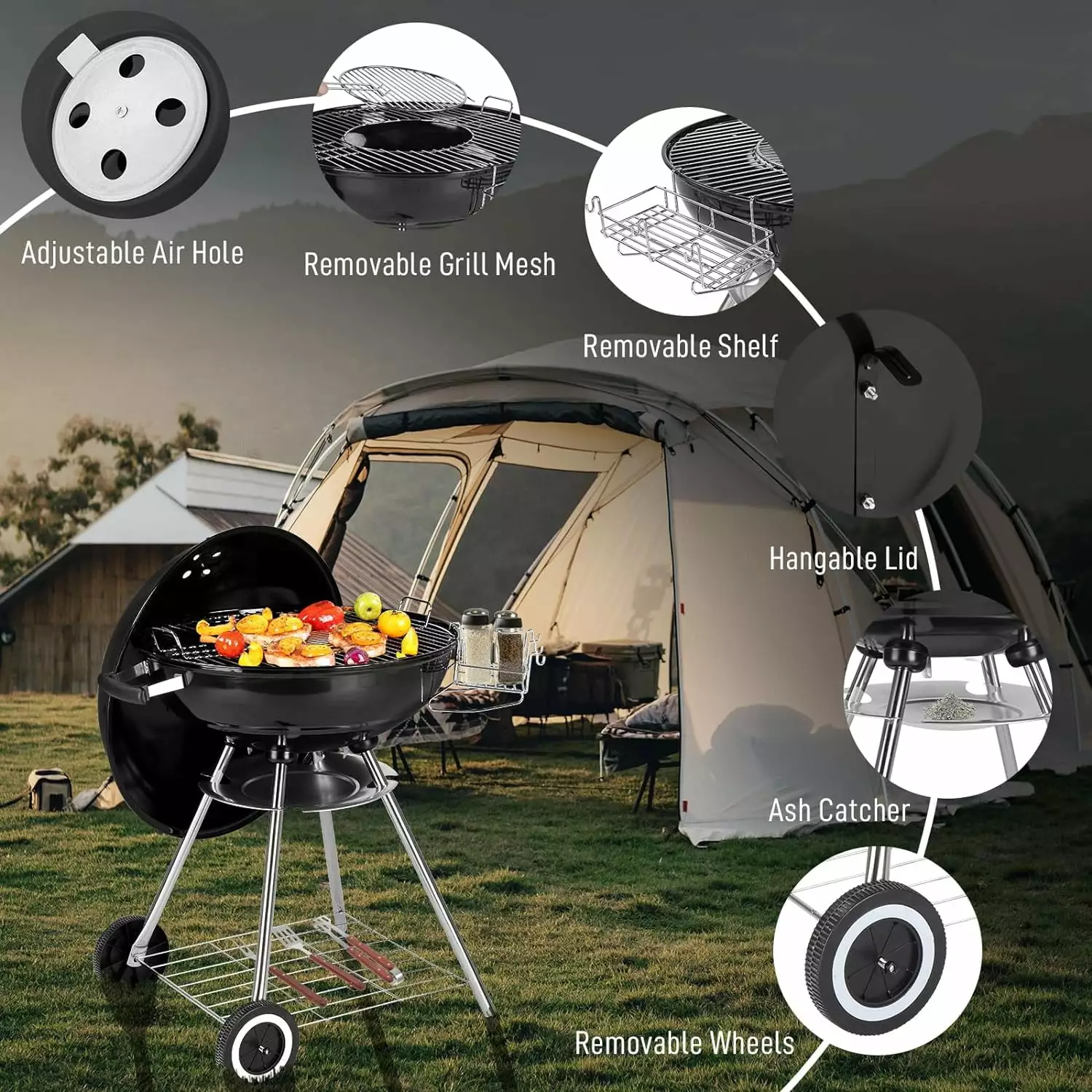 With its large 28-inch grate. you’ll have plenty of space to grill up mouthwatering burgers. sizzling steaks. and succulent veggies for all your friends and family. The porcelain-enameled lid and fire bowl ensure heat retention and durability. so you can enjoy perfectly grilled meals every time. Say goodbye to messy cleanup with the removable ash catcher and one-touch cleaning system that effortlessly removes charcoal ash and debris. Take full control of your grilling with adjustable air vent and a built-in thermometer for precise heat monitoring. Plus. the lid holder and hook rack keep things organized and within reach. providing convenience and efficiency while you work your magic on the grill.