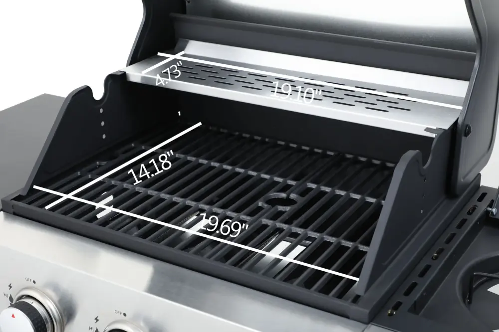 • Firebox: Steel, with high-temp resistant(550C) powder coating • 2pcs 3inch wheels with lock, 2pcs 3inch wheels without lock • Enamel cast iron cooking grids: 1pc 11.8×14.4inch+1pc 7.9×14.4inch • Warming rack: #430 Stainless steel warming rack • Ignition system: Push and turn, integrated automatic easy ignition • Thermometer: Stainless steel(100-800F) • Flame tamper: Enamel flame tamper, 3pcs • Control panel: #430 Stainless steel control panel • Control knob: ABS control knob and Stainless steel knob base • Bottle opener and hooks: #430 SS bottle opener, 1pc, with 2pcs hooks • Product size: 44.5x19x45inch • Cooking area: 19.3×14.6inch+19.3×4.7inch • Side table: Metal, black powder coating, 11.4×17.3inch • Power: 9560 BTU * 3 + 8550 BTU*1=37230 BTU • Front door: #430 Rust-resistant steel front door, twin layer • Packaging size: 24.6×21.25×20.67inch