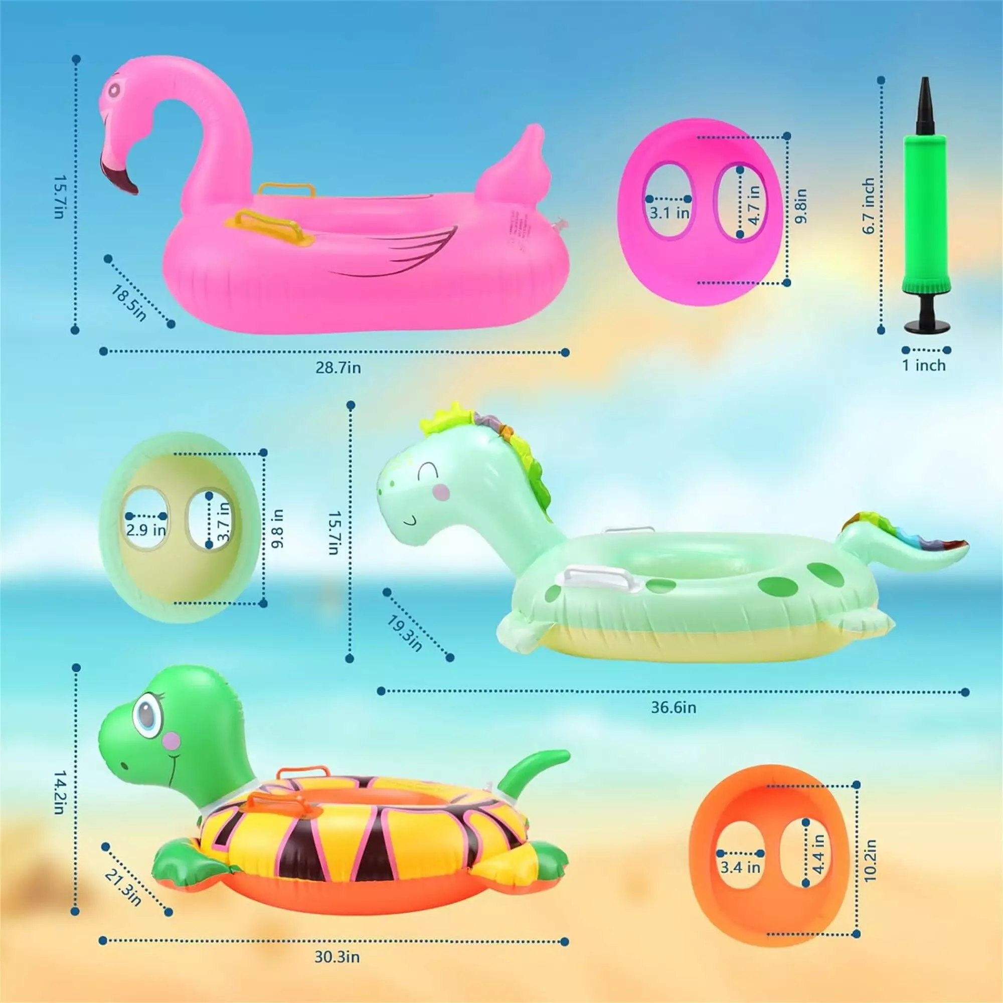 - Suitable Size for Kids: Swim ring sizes – Flamingo 28.7 x 18.5 inches. Turtle 30.3 x 21.3 inches. Dinosaur 36.6 x 19.3 inches. small in size