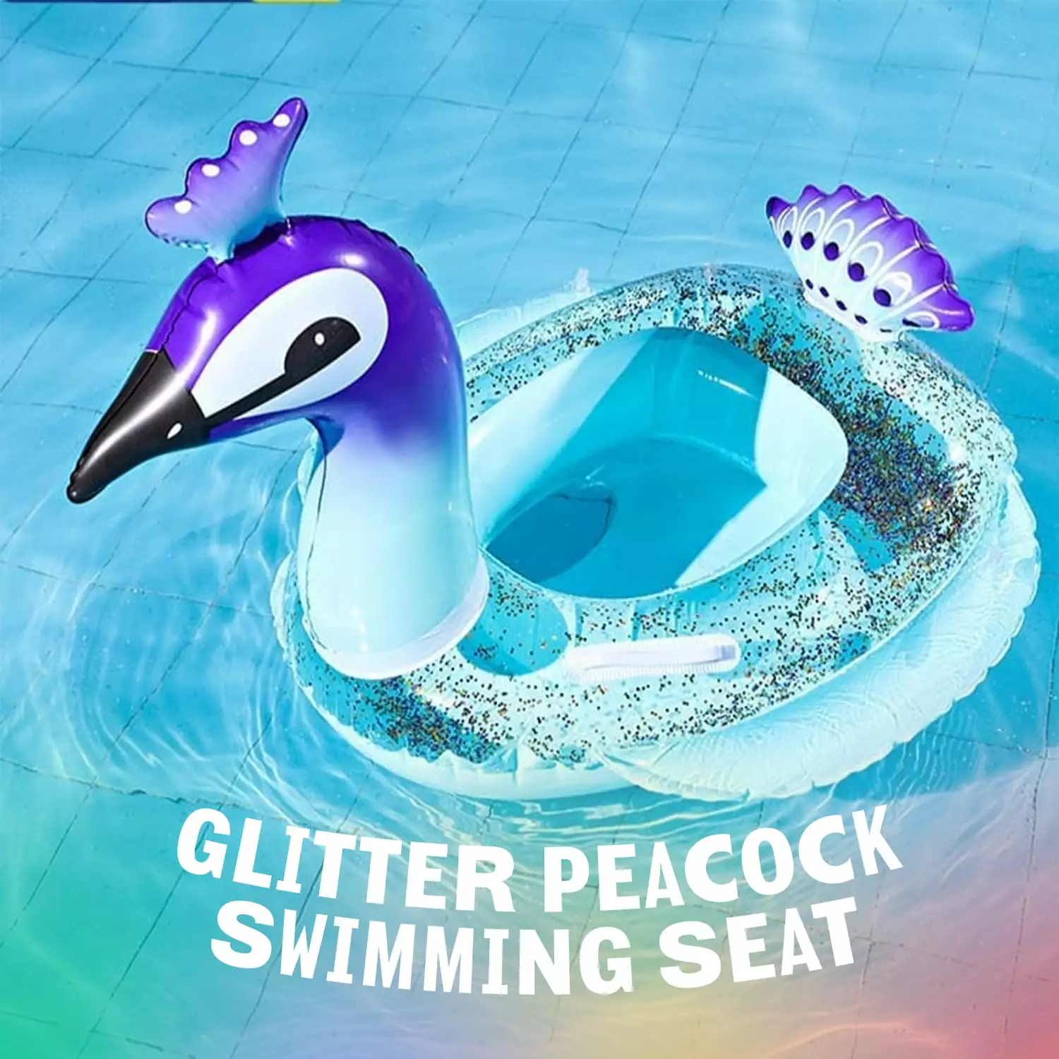- The Peacock Glitter Ring pool float is fun and shiny! Each component is sized to match the whole frame and provide balance in the water.