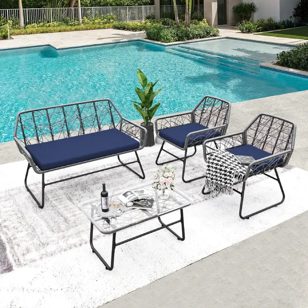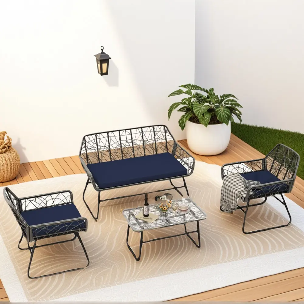 4 Piece Wicker Patio Furniture Place Tempered Glass Table And Detachable Cushions4 Piece Wicker Patio Furniture Place With Tempered Glass Table And Detachable Cushions