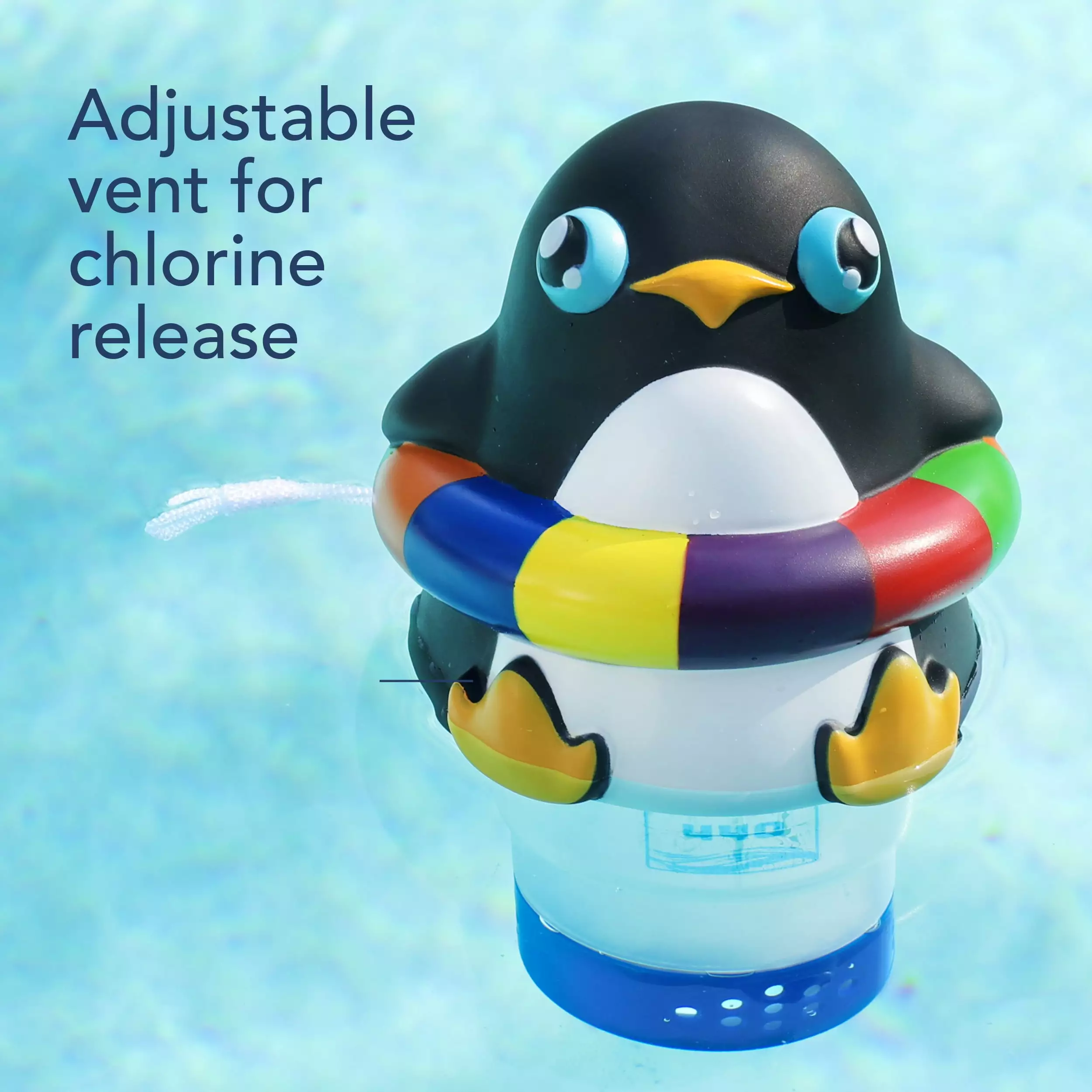 - COLORFUL FLOATING POOL CHLORINE DISPENSER: Our floating chlorine tablet dispenser has a cute cartoon penguin on top of it.