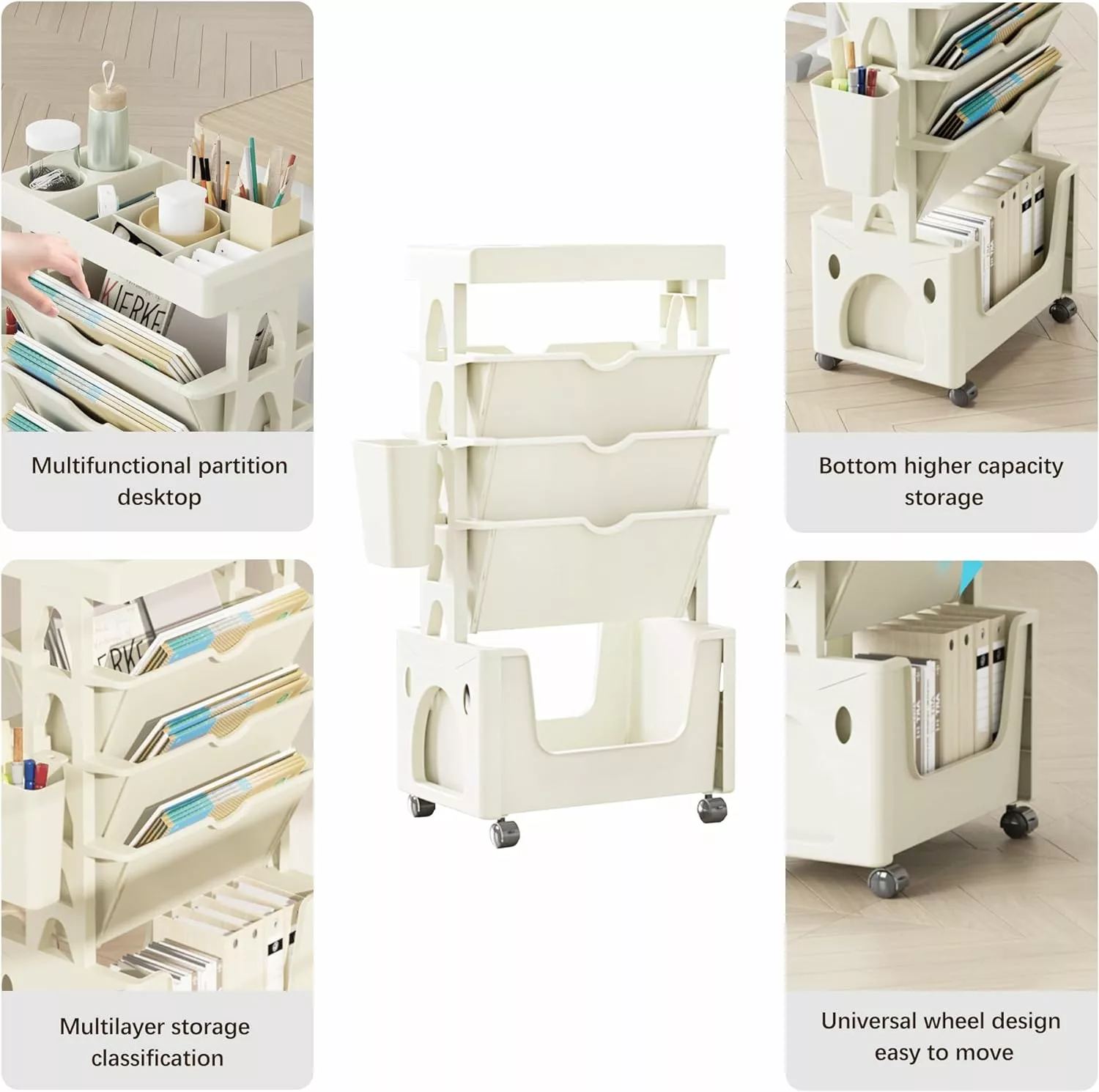 Product Description Small but Useful Requires less than 0.1 O of floor. but can provide you 5 surprising large capacity shelves. Friendly Design Desktop sorting is easy to handle and put away. rounded edges don’t hurt hands. Security and stability are Paramount The wide bottom and locking wheels make your car extremely stable when moving or stopping. The joy of DIY. assembling your favorite bookshelf You can choose how many shelves to install according to your needs .the most important thing is live happily. Brief content visible. double tap to read full content.Full content visible. double tap to read brief content.
