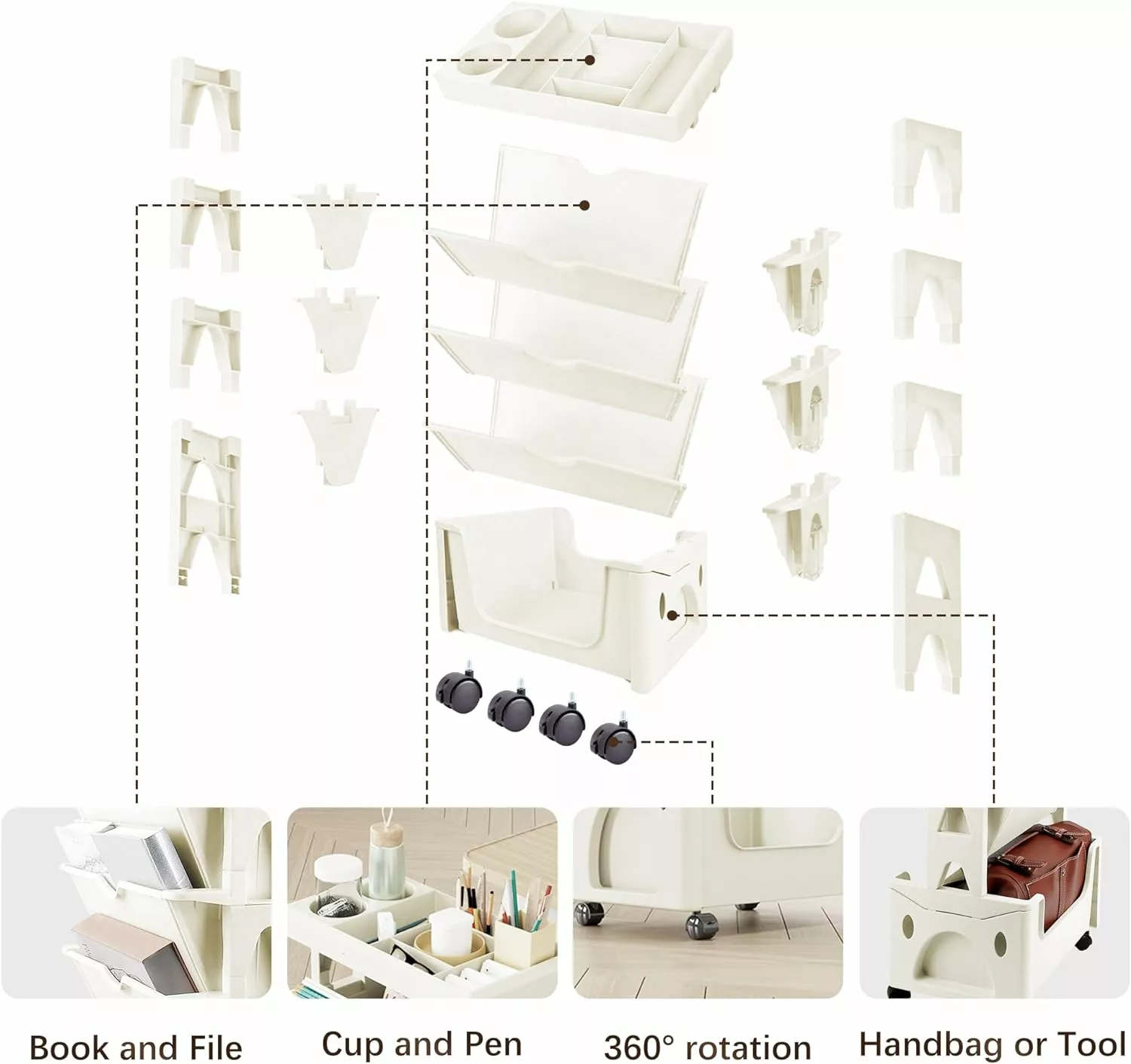 - [Lightweight Material. Stable Design]High-quality plastic coupled with a stable four-wheel bottom design gives you convenience and security. If you want to go from the study to the bedroom to study or work. you only need books. pens. cups and other items on the top. a desk cart will becomes a portable storage box can be easily transferred. without forth several times