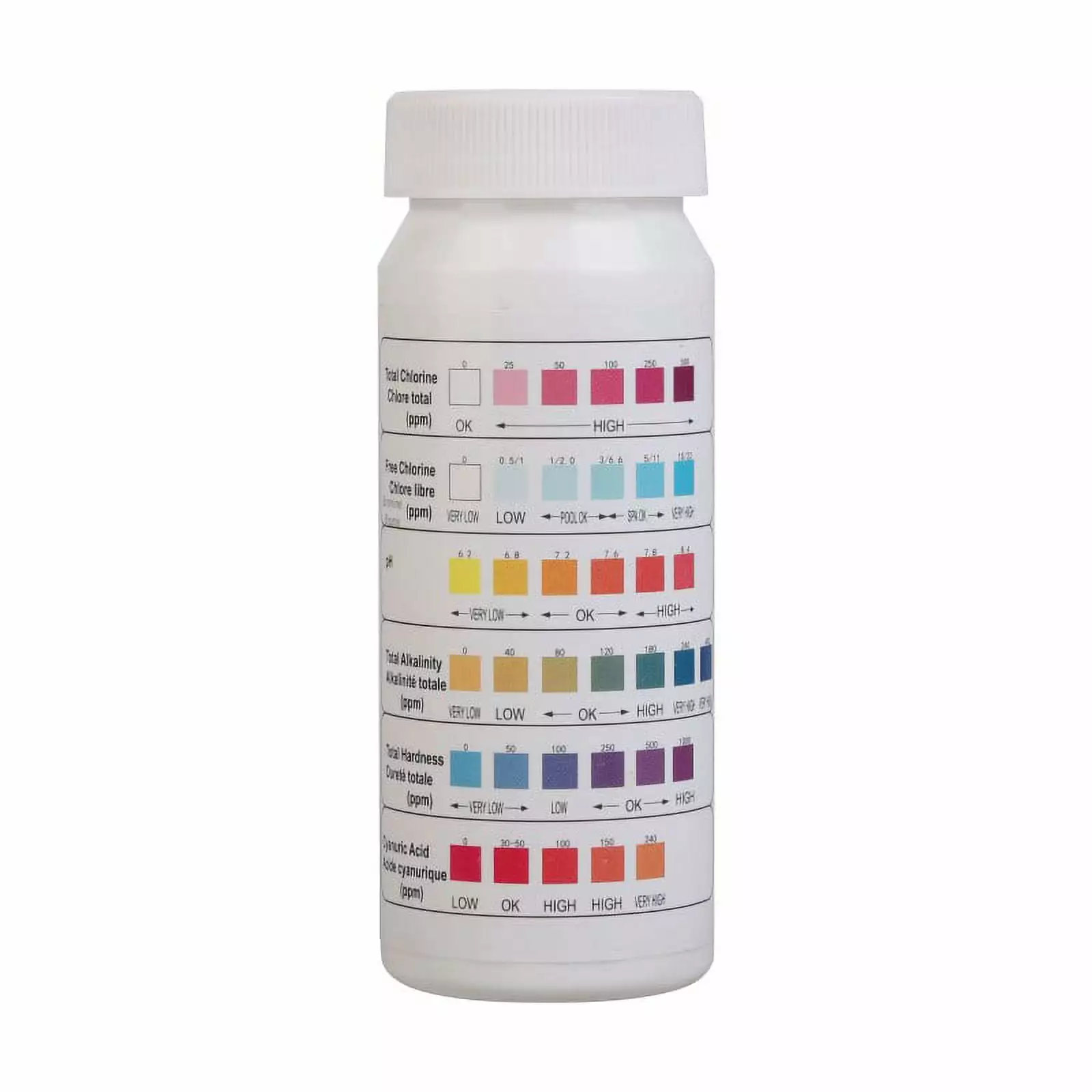 - Test free chlorine. bromine. pH. total alkalinity. total hardness and cyanuric acid.