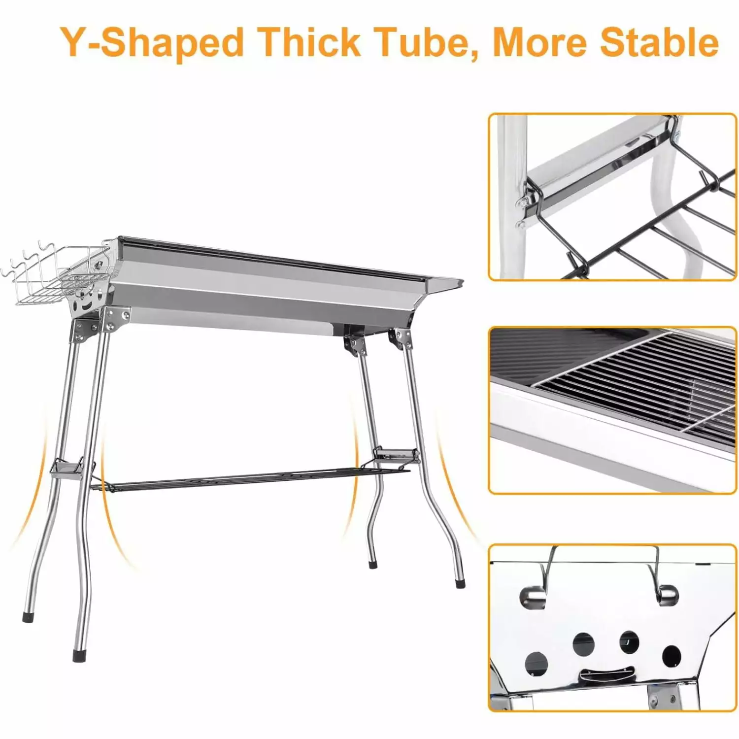 - [Easy to Assemble & Use]The Grill comes with an easy-to-follow instruction for stress-free assembly without tools. just open it and put four feet down and fold the legs and it is ready to go with handle after using. With air ventilation design on both ends of the grill. air flow Can be easily controlled and heat will be evenly distributed throughout the grill. The grill has a charcoal-holding grid at the bottom so your hot charcoal stays up and is not extinguished by the ashes it generates.