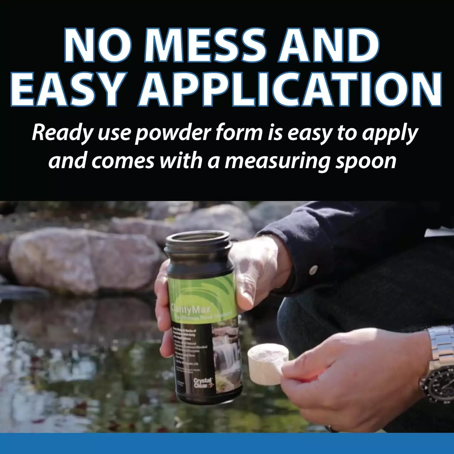 ClarityMax Pond Cleaner. 1-Lb.CrystalClear. LB. ClarityMax . Multi-Purpose Cleaning Action Cleans Ponds With Barley. Bacteria. Enzymes & A Powerful Secret Ingredient. Cleans. Polishes & Breaks Down Organic Materials. Removing Slimy Debris In & Around Ponds. Waterfalls. Streams. Plant Pots & Filtration Systems. Contains Activated Barley. Safe For Use Around Aquatic & Domestic Animals.