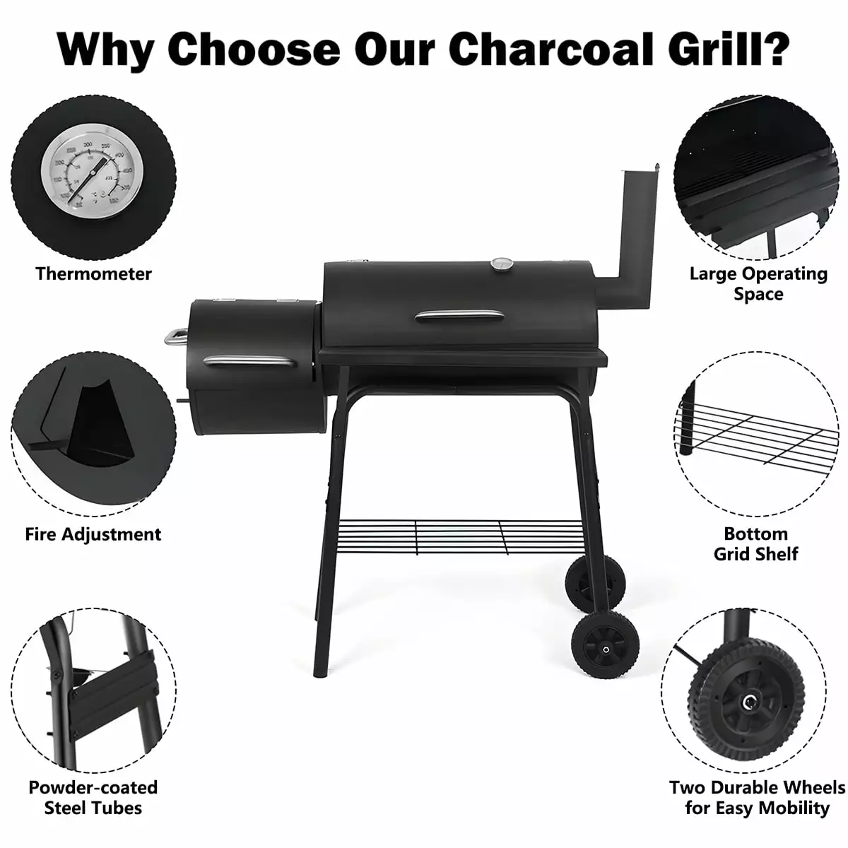 - Portable and Versatile Design: Whether you’re hosting a backyard barbecue. tailgating. or camping. our charcoal grill’s portable design and sturdy construction ensure convenient transportation and reliable performance wherever you go.