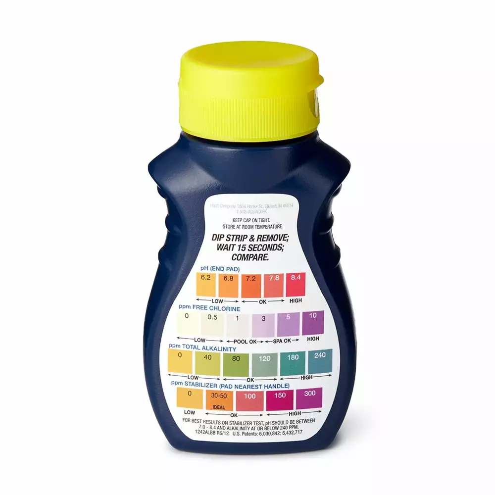 These AquaChek Yellow test strips from Hach will test your pool and spa water for free chlorine. pH. total alkalinity and cyanuric acid. Just dip a strip into the water for one second. and remove immediately. You’ll have your test results in 15 seconds. To keep your pool at its best. test at each end of the pool at least twice a week. and test your spa before each use. Bottle contains 50 test strips. Instructions included in 15 languages.