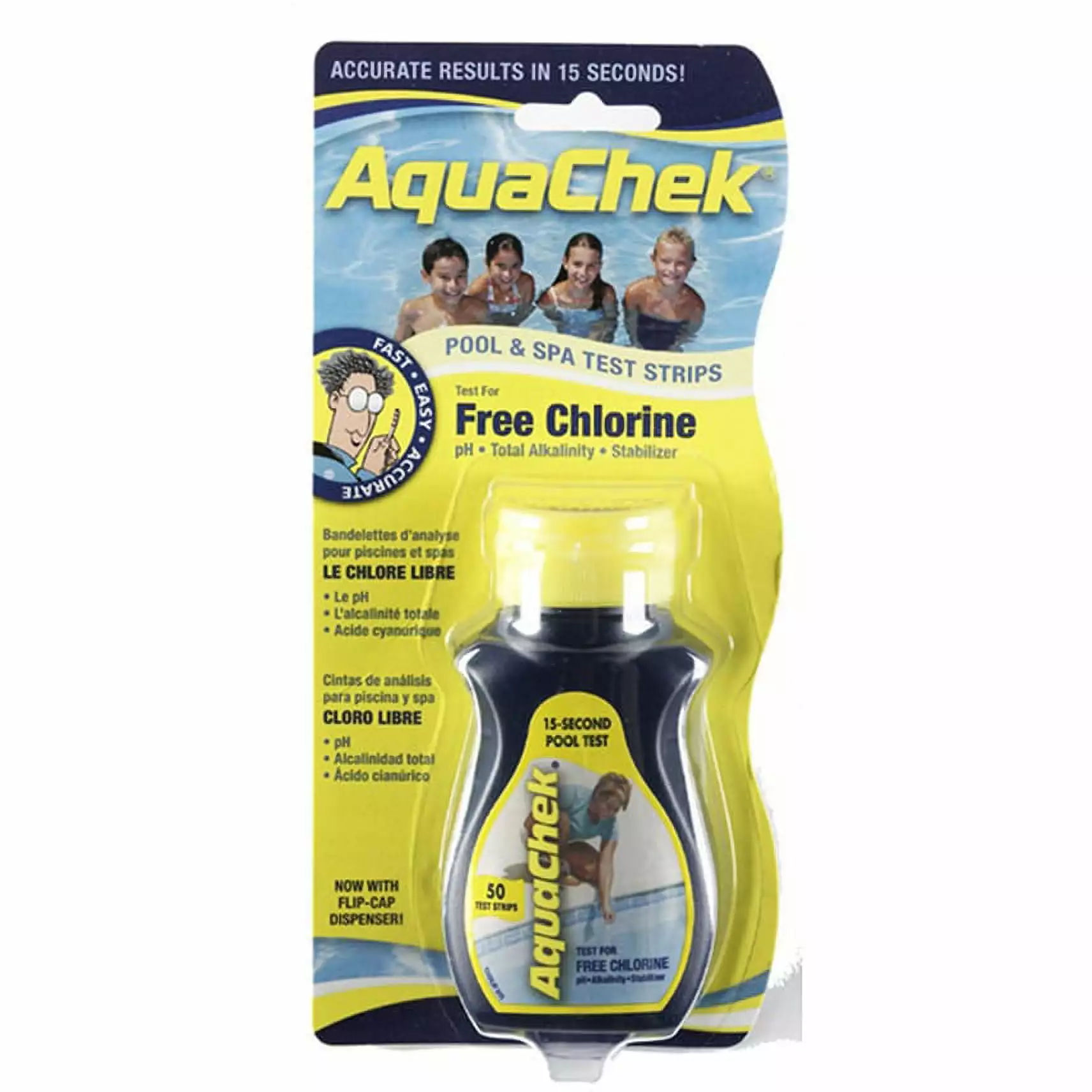 - Tests for: free chlorine. pH. total alkalinity. Cyanuric acid (stabilizer)