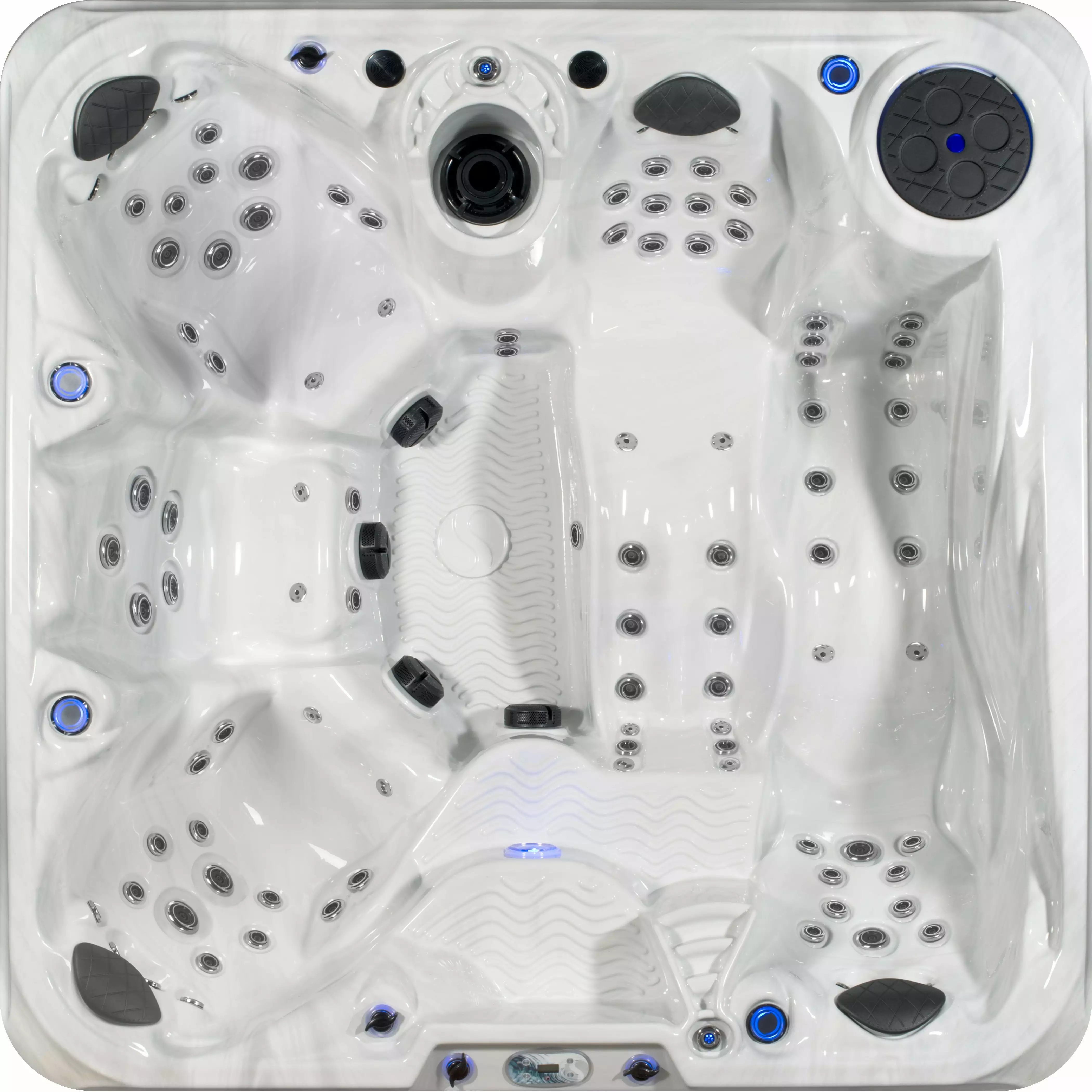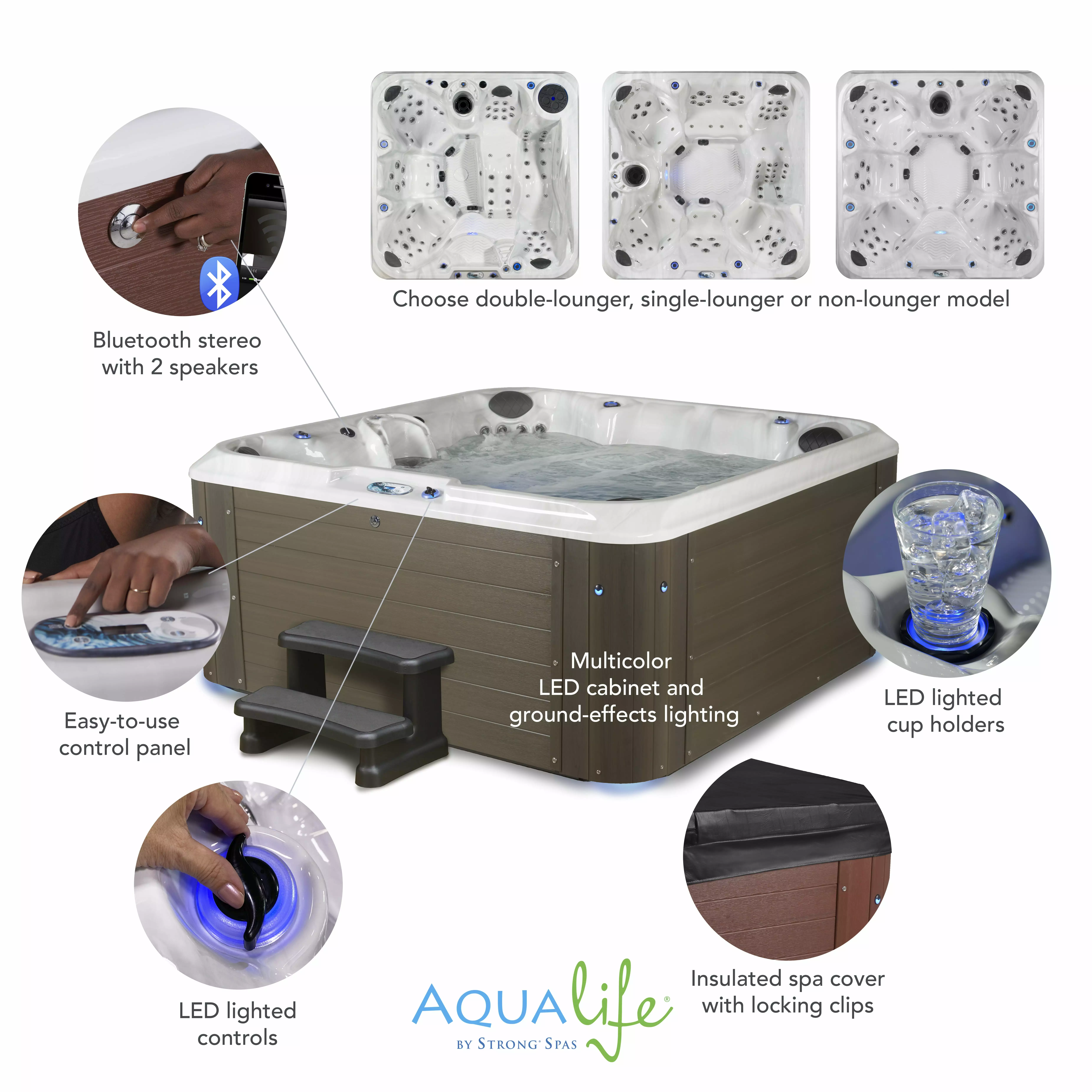 The Amplified Series combines the luxury of sound with 3 spacious seating arrangements. Elevate the way you feel every day. 100 stainless steel hydrotherapy jets (80 are adjustable) target the areas where you want relief the most. With Bluetooth integrated sound system connectivity. Amplified lets you stream music and audiobooks from your smartphone while you relax. Amplified delivers optimal water pressure through every jet. leaving you energized and refreshed. The Amplified spas have seating for up to 6 people with your choice of single-lounger. double-lounger and non-lounger models. The energy-efficient 5 BHP 2-speed pump. 5 BHP high-speed pump and 1 HP Blower have been specifically engineered to deliver powerful. yet comfortable. deep tissue massage. A stainless-steel heater consistently maintains your ideal water temperature. You control your spa experience. your way. with our user-friendly backlit digital topside control. Beautiful LEDs enhance the water cascade. beverage holders. and control valves. Additional lighting effects are in the main light and exterior cabinet lighting for improved ambiance and safety. Our cabinets are UV-resistant. and maintenance-free. A factory-installed ozonator make maintaining your spa easy. Ozone delivers natural water purification. keeping your spa water cleaner and reducing the need for harsh chemicals. The tapered insulated and locking spa cover also helps keep spa water free of debris and increases safety and efficiency. 2-tier spa steps are included. too!