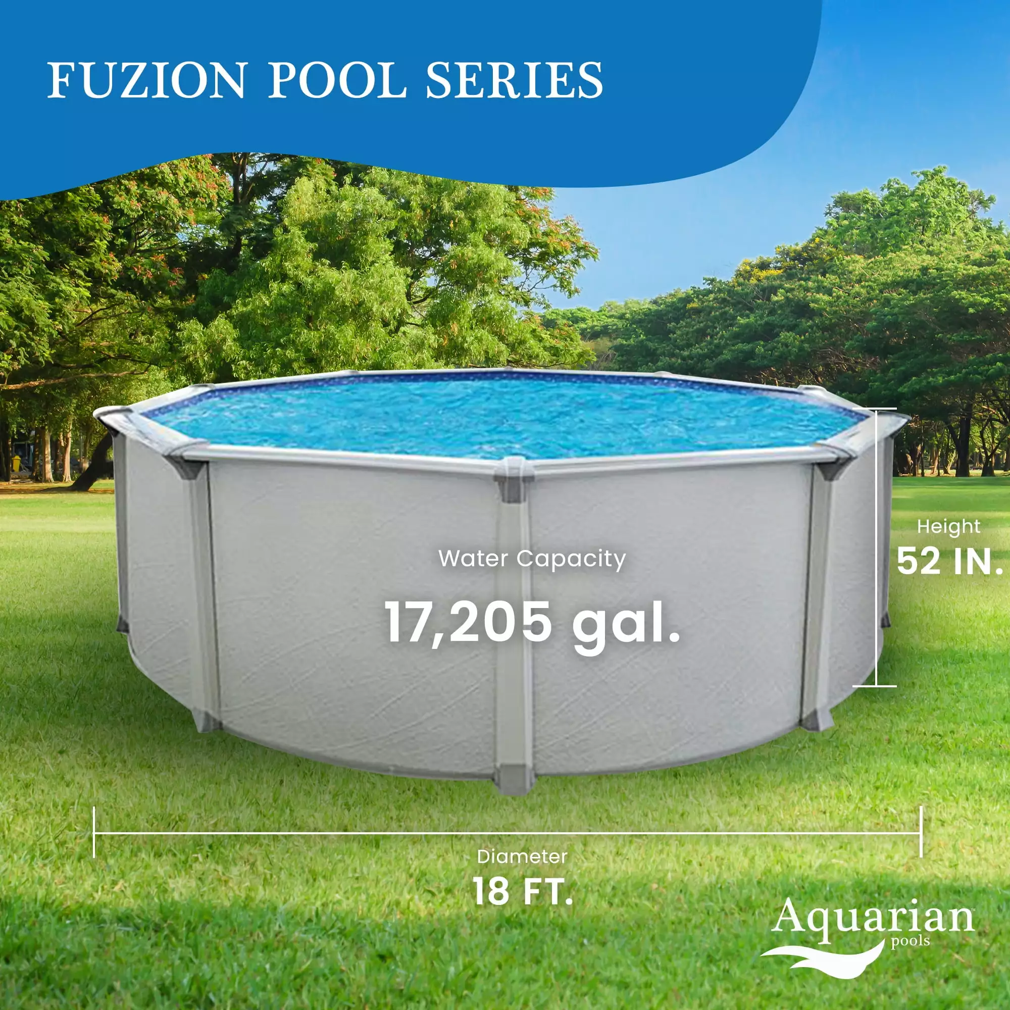 Get outdoors and have some fun in the sun this summer with the Fuzion pool series. For this round pool the liner and skimmer are sold separately. This pool is 18 feet round and 52 inches high to provide fun for all ages. The pool’s resin and steel construction provide durability for years of hassle-free use and the sharp marble wall design adds an appealing feature to your yard. The pool features 8-inch resin top rails. 6-inch steel vertical posts. and 2-piece injection-molded high-impact resin connectors. Don’t miss out on the fun you could be having with your family and friends this summer and add the pool to your backyard party. Listing is for the pool only. Liner. skimmer purchased separately. Please note: For best water care. only use pool chemicals. DO NOT use bleach.