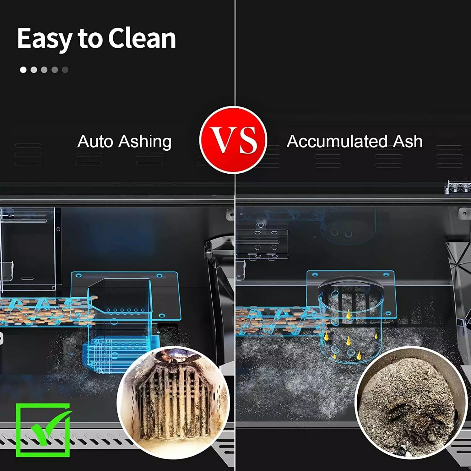 Our premium pellets burn at about 8500 BTU per pound.That means our pellets will reach 500 H. 15% faster.stay hotter.and burn longer.so you don’t have to go through bags of pellets constantly. With the new Micro-Particles Technology.you can choose any liquid seasonings.diluted sauces.and so on to create unique flavors like never before. ASMOKE comes equipped with a side bucket to collect extra oil and grease for easy disposing.New ASCA System with auto clean ashes function. Super versatile. support BBQ. Bake. Roast. Braise. Smoke. Sear. Broil. and Char-Grill. gets you wood fire flavor at the convenience of propane or gas.