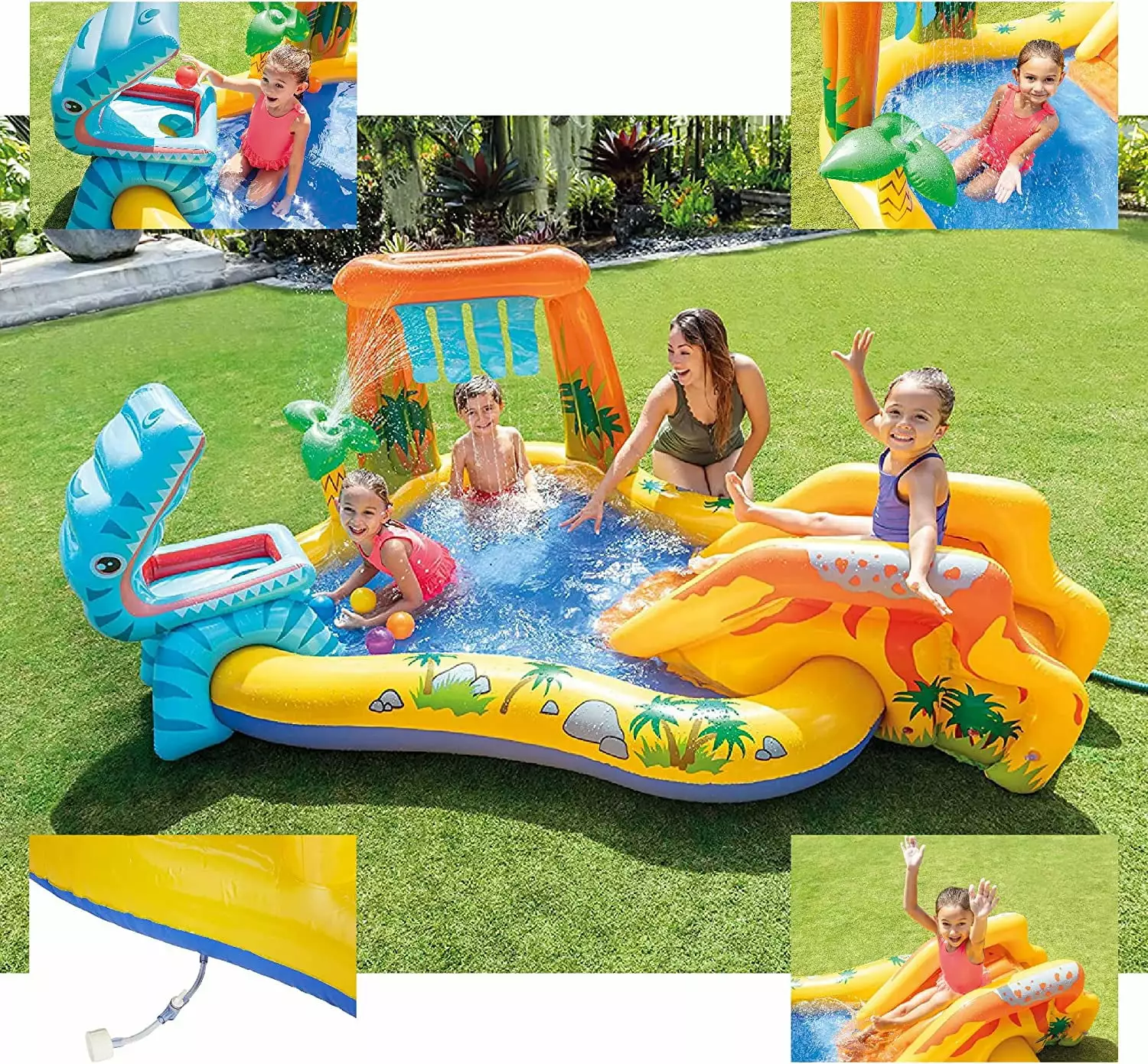 - Inflatable Play Center & Pump – The kids are sure to keep cooled off & entertained for hours in this wading pool. with the palm tree sprayer & cascading waterfall that attaches to a garden hose for endless enjoyment. Feed the hungry dino with the 6 included colorful fun balls. or glide down the volcano water slide with a soft-landing mat to land on. Even comes with a sleek & portable electric air pump. with 3 universal adaptable connection points!