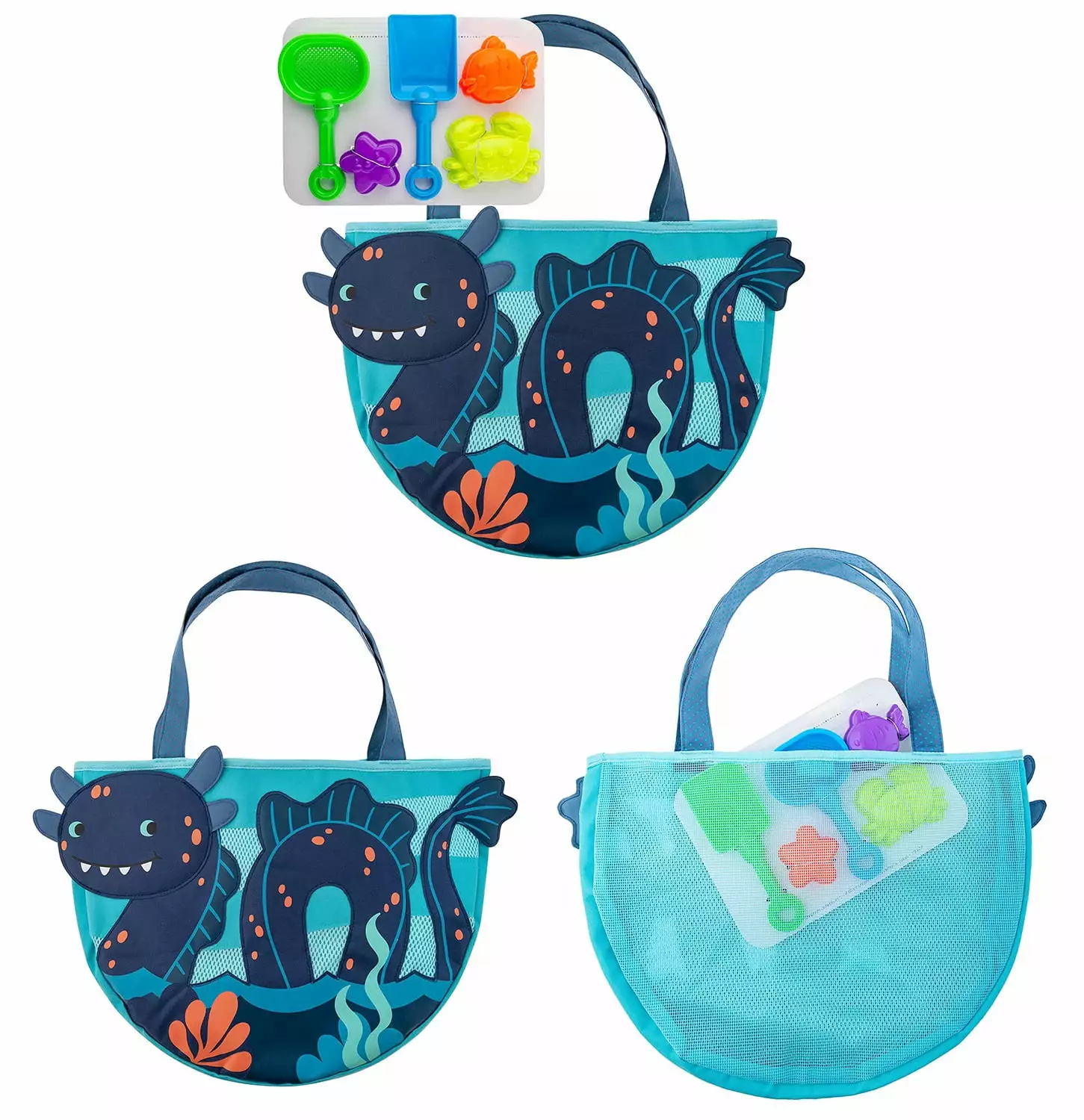 - Transform your yard into an island oasis adventure! This bundle includes a large dinosaur inflatable play center with a slide. an electric air pump. a sea monster hooded towel. a sea monster pool or beach bag with 5 water toys. & a pair of timeless pirate camo print sunglasses. Your little ones will have endless hours of fun. while staying cool & fashionable.