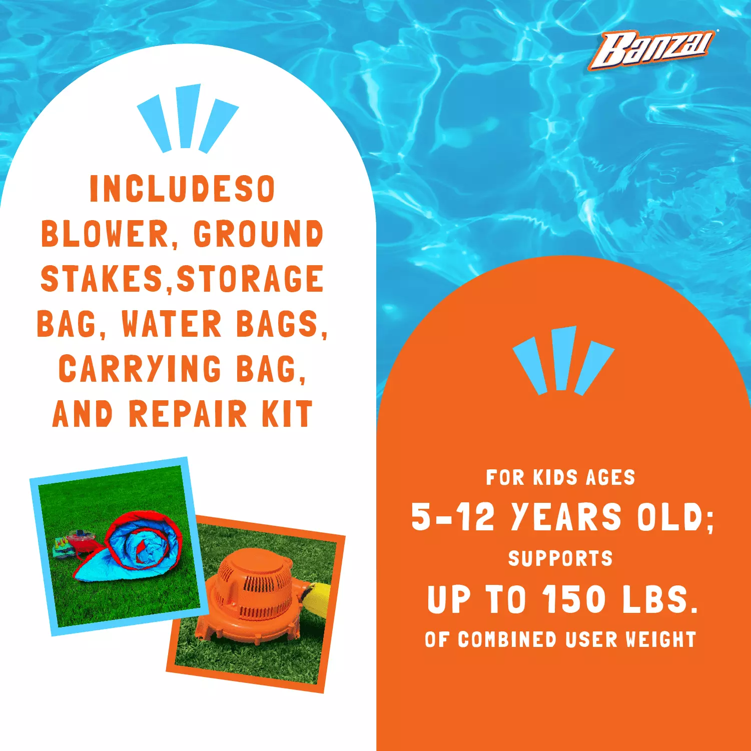 Have some fun in the sun with this Banzai Slide ‘N Soak Splash Park. With it. you can suit up and get drenched in no time. Make your way up the side-climbing wall and race down the water slide before landing in the refreshing lagoon-style pool. Or. take a break from all the fun by cooling off under the overhead shower sprinkler. With the included continuous airflow blower motor. all this fun inflates in less than two minutes. Heavy-duty Dura-Tech construction ensures lasting strength and durability. This Banzai splash park also comes with a water-spraying hose assembly. three blower stakes. seven bouncer stakes. a carrying bag and repair patches.