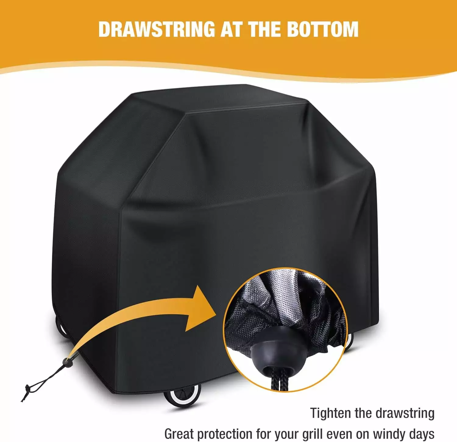 [Windproof Design]The drawstring at the bottom of the grill cover can be tightened to secure it to the grill. so you don’t have to worry about being blown away even in strong winds.