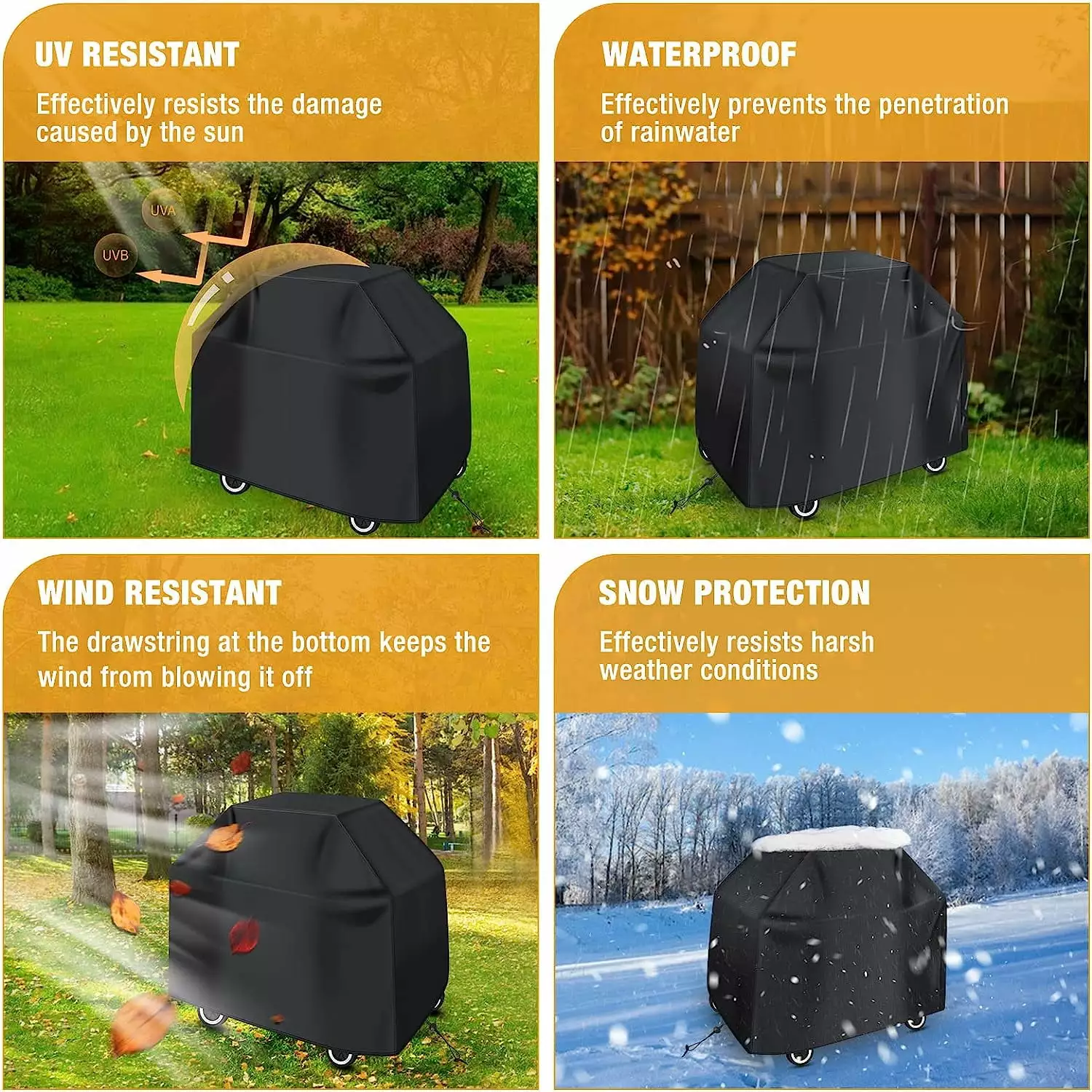 [UV Protection and Fade Resistance]The inner layer of the outdoor grill cover is coated with UV coating. which can effectively resist UV rays and provide excellent sun protection without fading.