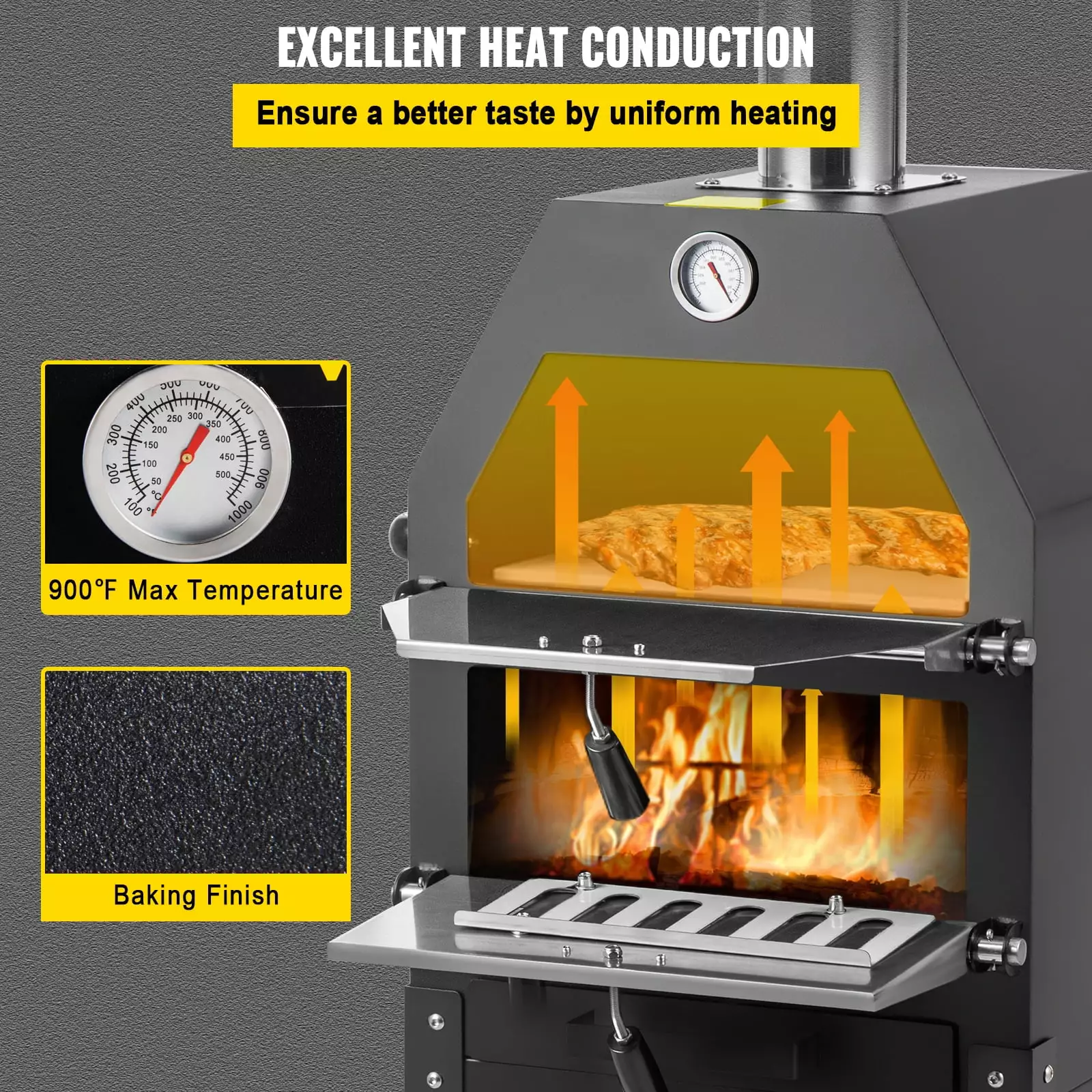 - Perfect Temperature Treatment: Built-in Thermometer displays the max 930 H baking temperature in real-time. allowing you to control the fire temperature by adding and reducing charcoals accurately. With surface black baking paint. our wood fire oven possesses high thermal conductivity for efficient and even heating. providing you with delicious pizzas in a concise time.