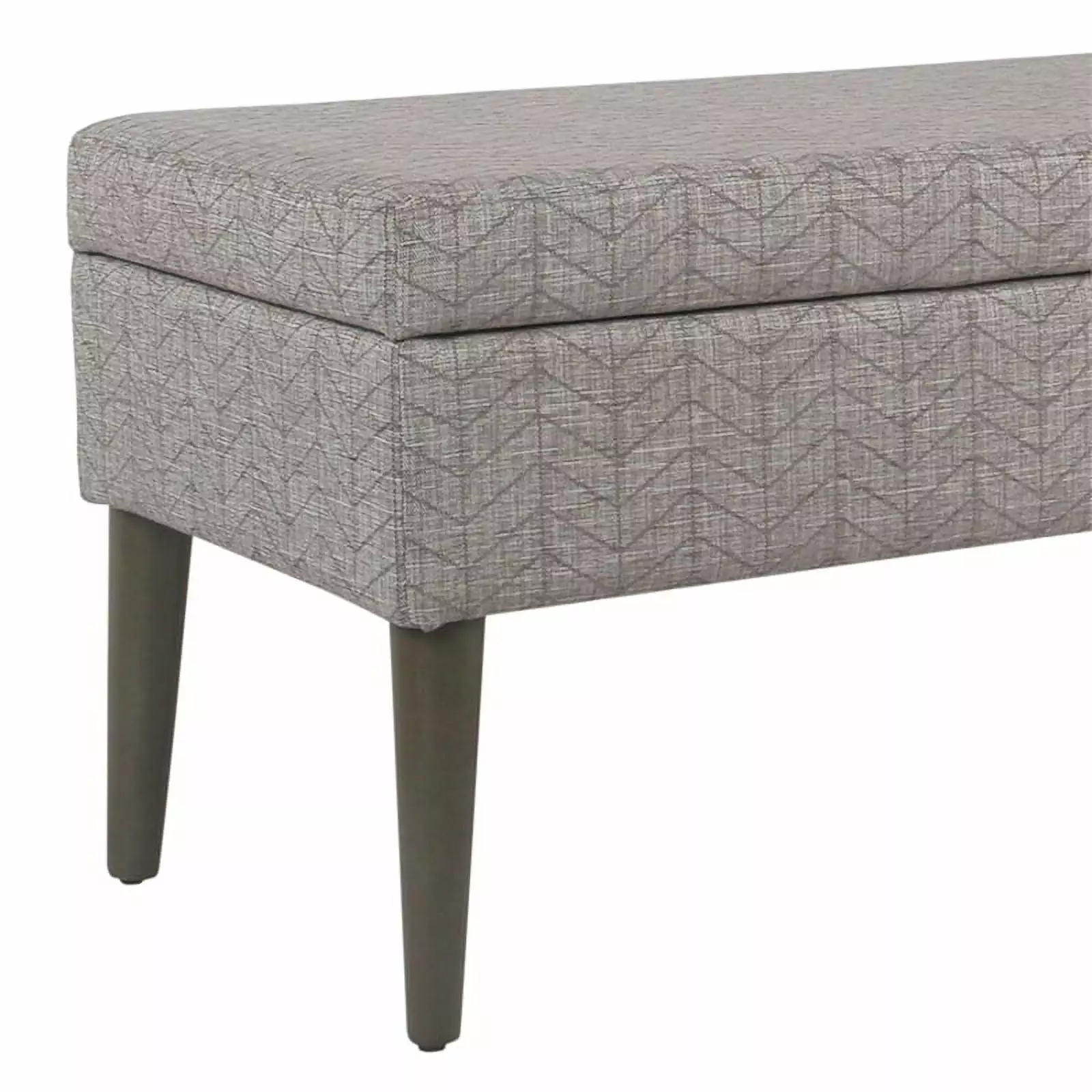 Bring this storage bench to stay organized as well as to make your home look stylish at the same time. With wooden frame and covered in gray chevron patterned fabric padded upholstery. this bench features lift top hinged lid. providing ample space for storing extra pillows. blankets. bed linens. magazines or toys. This bench can also be used as a sit alone furniture piece for sitting or add it on entry way or in any room to give additional storage.