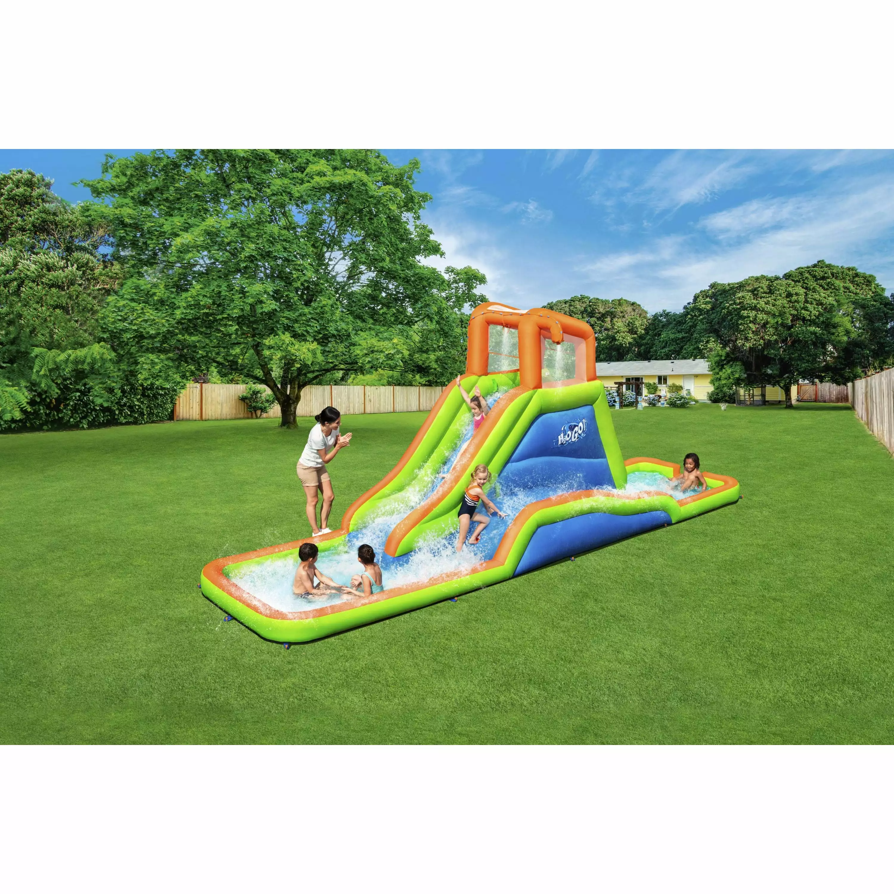 Climb into your next adventure with the Bestway H2OGO! Aquaventure Kids Backyard Water Park. This inflatable water park has everything a kid needs to stay entertained all summer long.The Aquaventure water park is made for kids to splash. slide. and climb. Kids can scale the climbing wall. slip down the slide. get sprayed by the shower sprayers. and splash in the splash pool. This water park features a tall mega slide and a mini slide – perfect for racing and playing. Both slides have a shower sprayer above them to soak kids and to keep the sliding surface nice and slippery. Plus. each slide leads to an extra-large play pool. Double the slides. double the sprayers. and double the play pools. makes for double the fun.Built for kids in the rough-and-tumble summer. this backyard water slide features durable. double-stitched PVC material.This giant water park inflates in less than 2 minutes with the included blower. The inflatable water slide is suitable for kids ages 5 to 10. and supports up to 120 pounds per kid or 600 pounds overall.Overall. the inflatable water park measures approximately 22 feet long. 6 feet wide. and 8 feet tall.