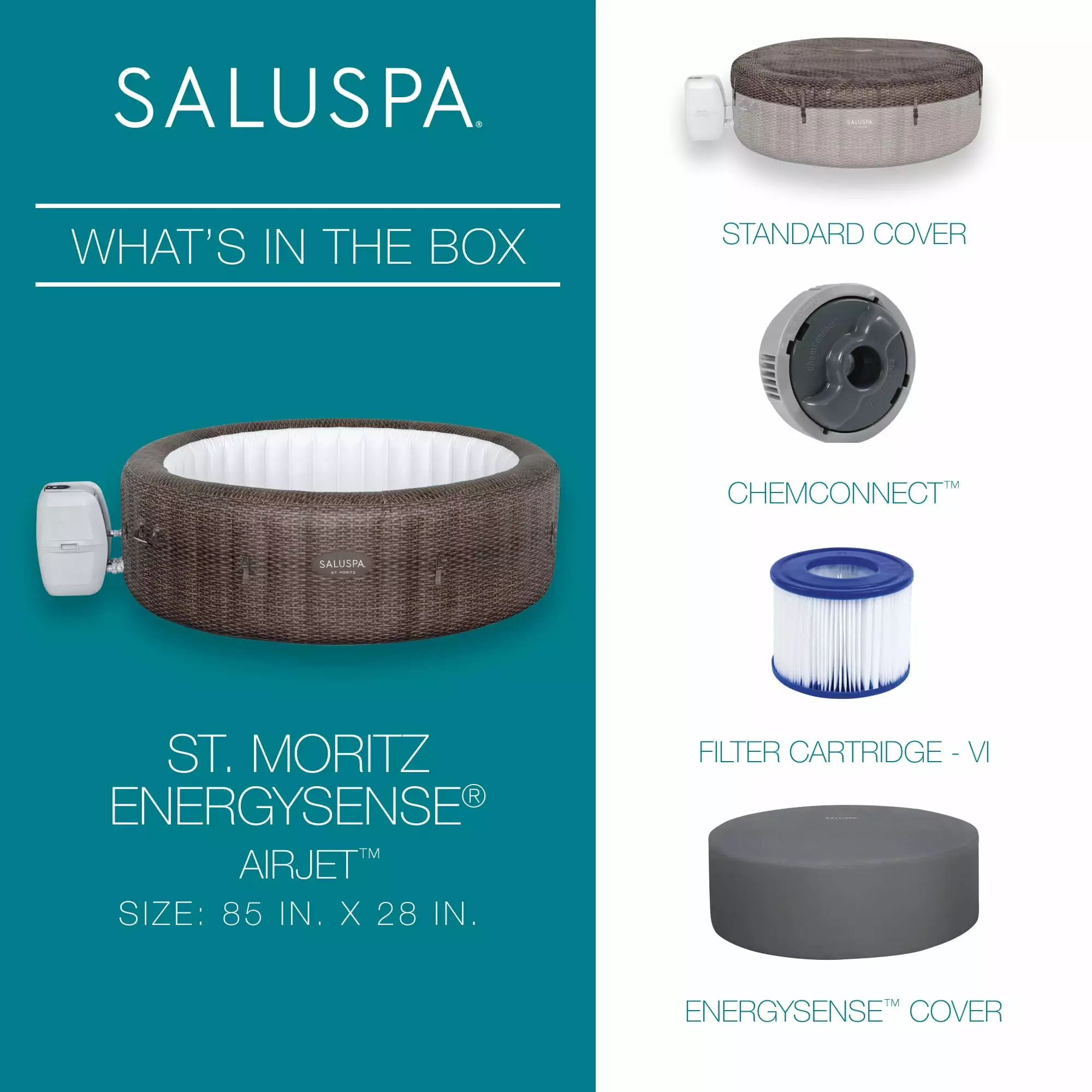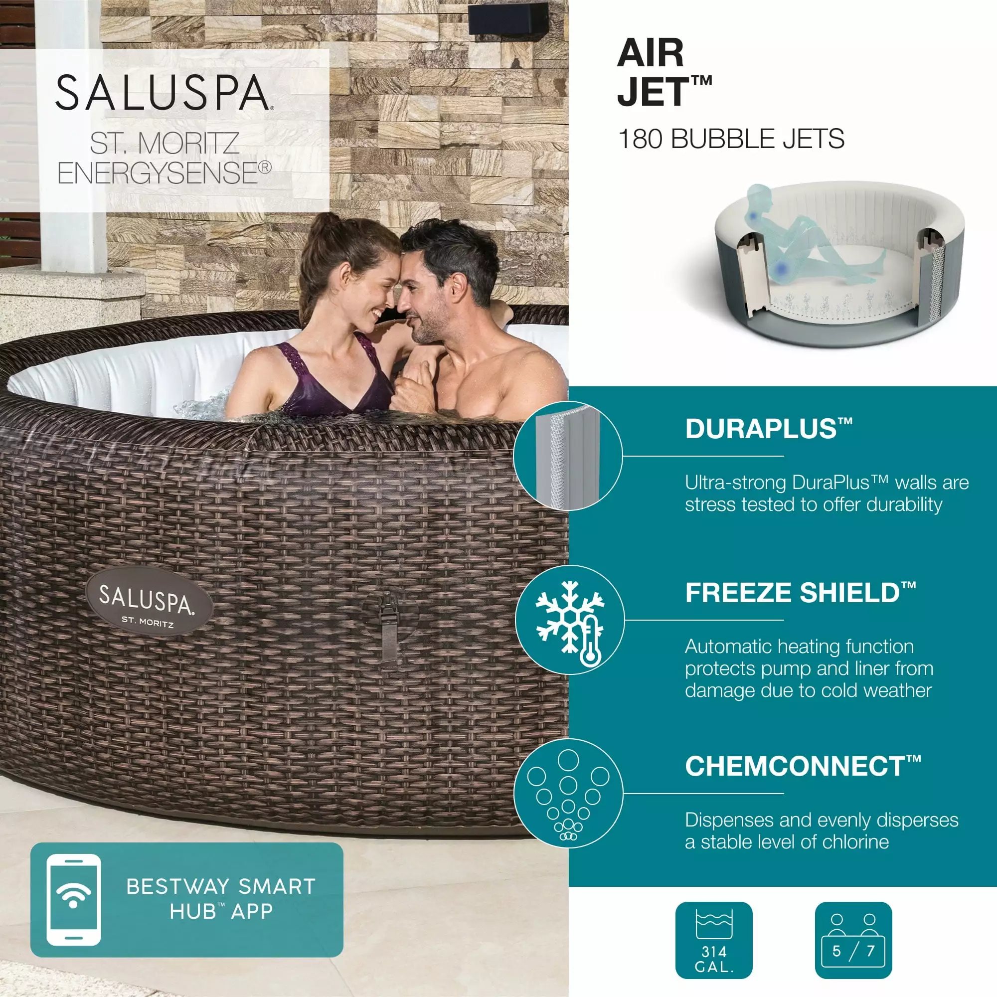 After a long day. nothing is more relaxing than sinking into warm. bubbling water in your backyard. The spacious. round design of the Bestway SaluSpa St. Moritz Hot Tub provides a soothing massage experience for up to 7 people. Simply attach the pump and watch as it inflates. Featuring an AirJet system with 180 jets. this hot tub releases bubbles from the bottom of the spa to create a warm. bubbling hot tub environment. These calming bubbles will help you relax and unwind from the comfort of your home. Whether you’re seeking a solitary escape or hosting a gathering of friends. this spa caters to your every need. Built with durable DuraPlus materials to avoid damage. you can ensure this hot tub retains its shape after repeated inflation and deflation. Including a FreezeShield with an automatic heating function. this hot tub’s inner components will not freeze during colder temperatures. The true game-changer is the included EnergySense Cover. which not only ensures the water remains at the ideal temperature but also conserves energy. making it a great choice. With a simple touch. you can transform your space into a private oasis where worries dissipate. Including built-in cupholders and a reinforced. insulated pool cover that locks in heat while not in use. you can be sure this spa is ready for when you are. Escape away to loosen your muscles with the Bestway SaluSpa St. Moritz Hot Tub Spa.