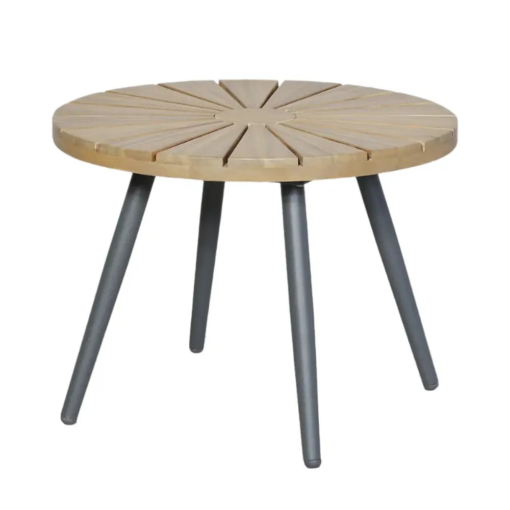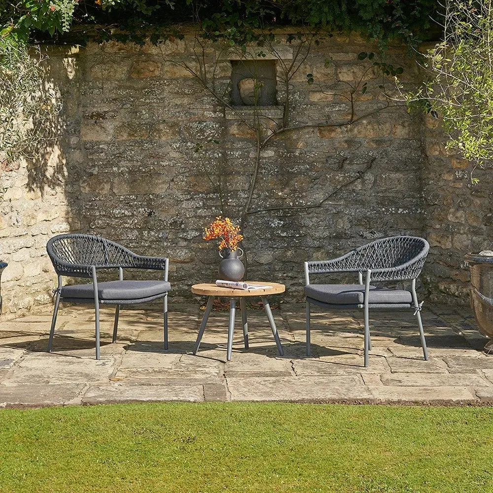 Enhance your outdoor space with the Bisou Outdoor Bistro Set. This stylish set, made in Vietnam, features a compact bistro table with a light teak effect acacia wood top, segmented into a star design. Acacia wood is an environmentally friendly choice due to the fast-growing nature of the wood. The 2 armchairs that sit impeccably with the stunning table have a black powder-coated aluminium frame, a black rope weave, and comfortable, season proof cushions in a stylish portable linen black fabric. The outdoor chairs have the extra bonus of being stackable, making the arrange a space saving solution.