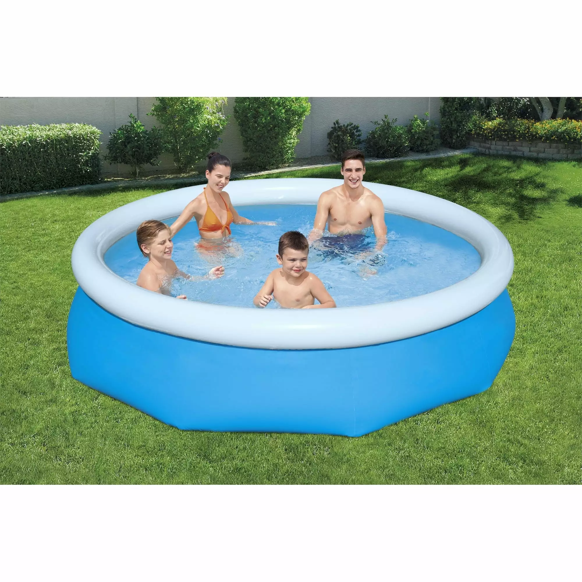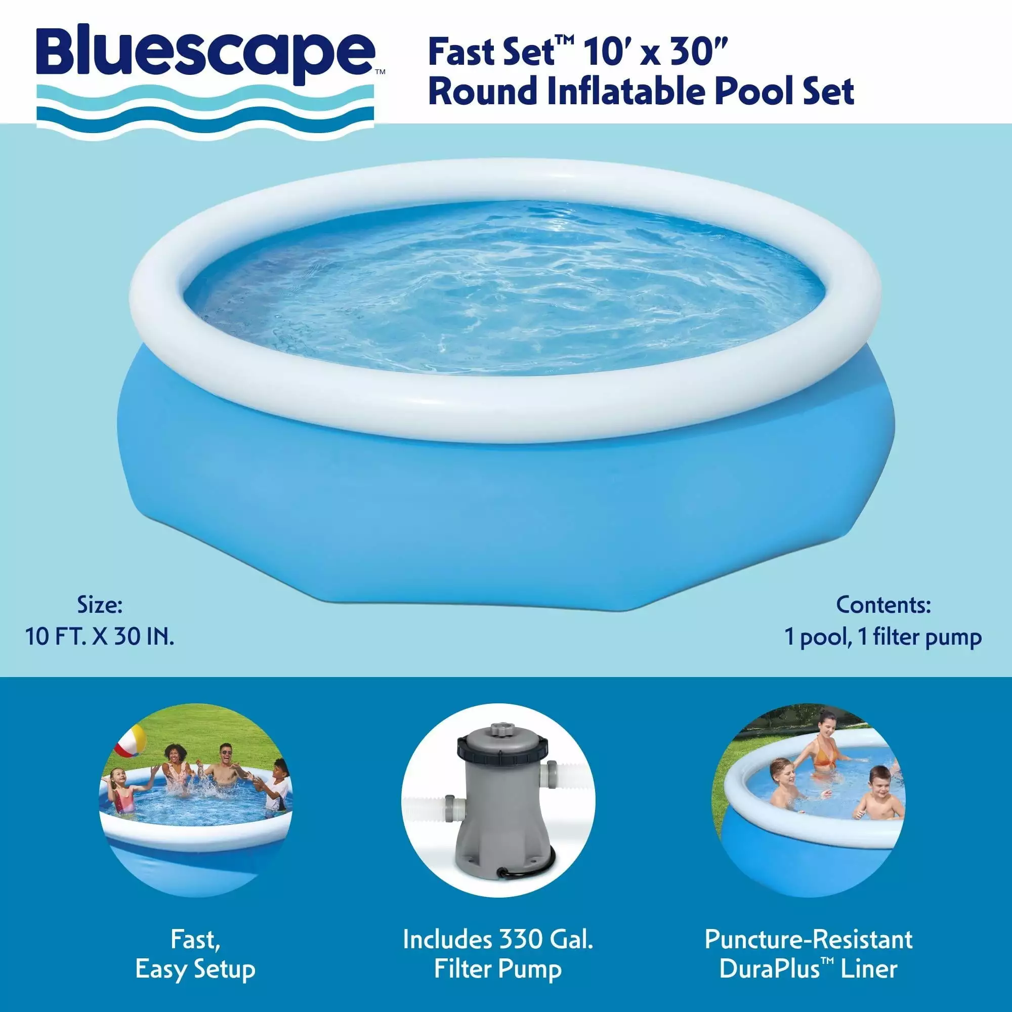 With this quick and easy Bluescape Fast Set Pool Set. you’ll be ready for a pool day in no time! The Fill & Rise set-up process is simple – just select a level surface. inflate the top ring and the soft sided above ground pool will rise as it’s filled up with water. The sturdy DuraPlus liner is made out of an ultra-durable 3-layer material that is reinforced for strength and is 85% more puncture-resistant than PVC. When the season’s over. storage is fast and simple. The water releases easily through the flow control drain valve. and then the pool can fold up for compact off-season storage. Also included with the set is a filter pump to help keep the water clean. This pool is the ideal choice for families looking for a quick and easy pool option for their backyard. Kids will enjoy spending their summer days splashing and playing in the water. and parents can enjoy a nice and relaxing dip as well. The season won’t be complete without the convenient Fast Set Pool!