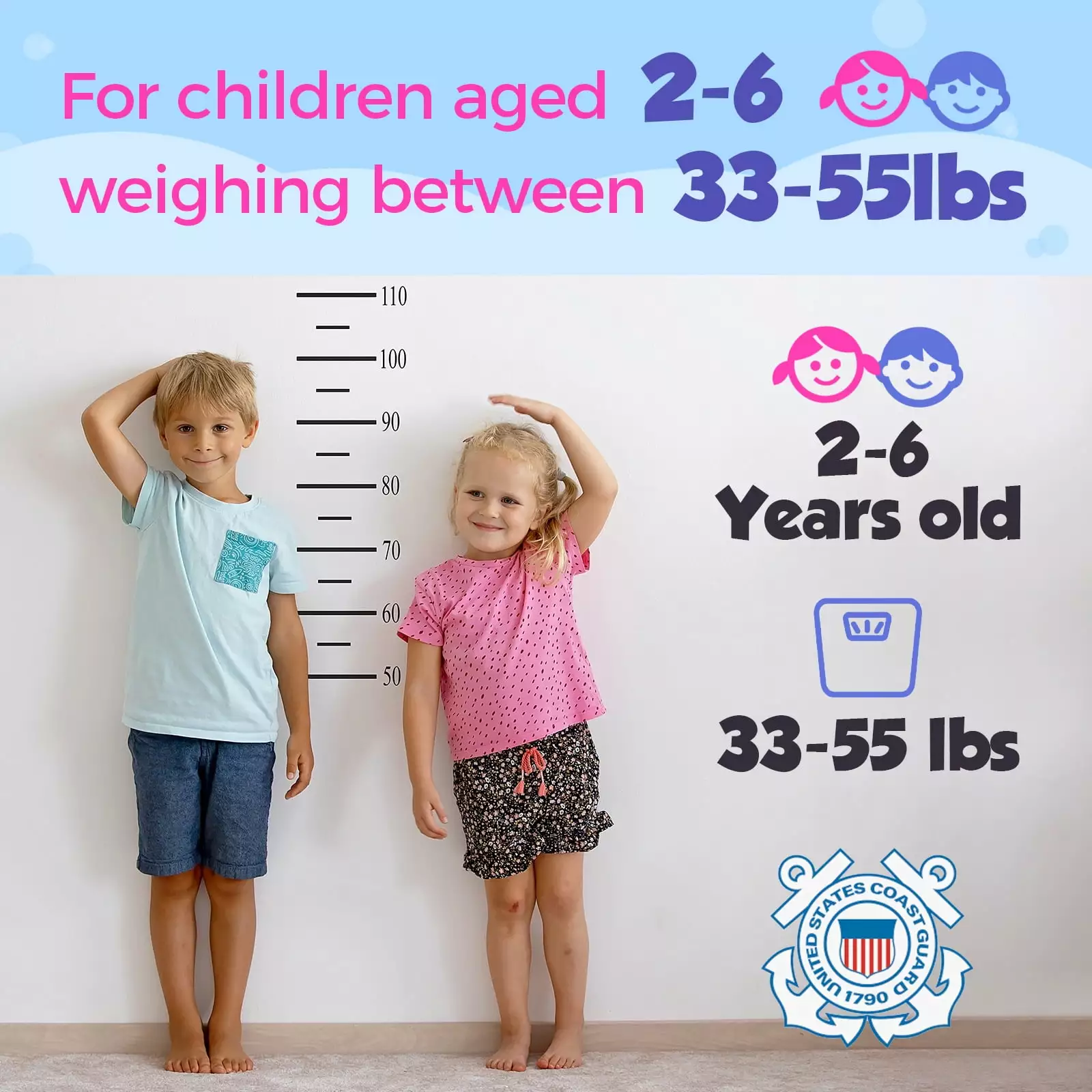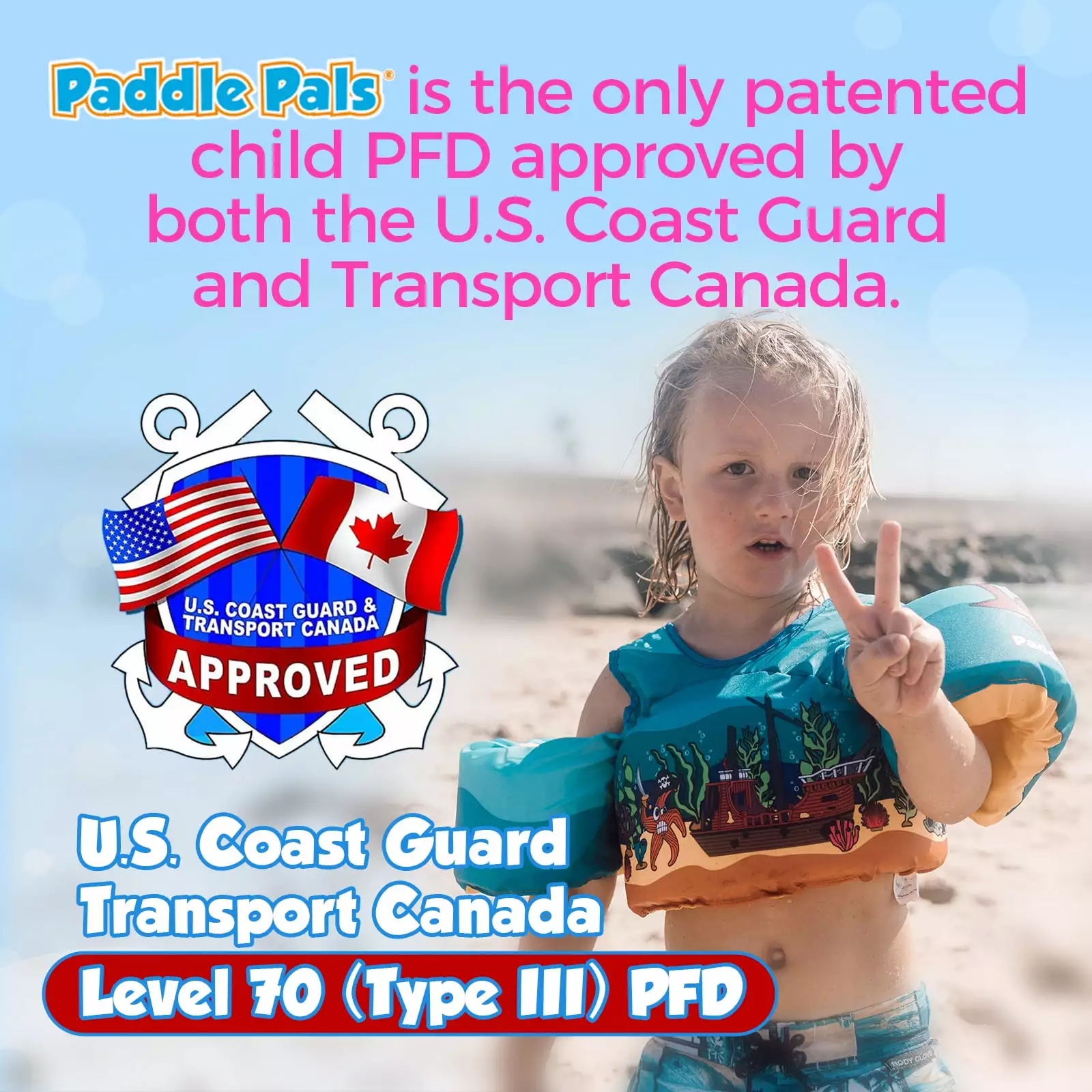 - US COAST GUARD AND TRANSPORT CANADA APPROVED – Designed for children weighing between 33-55lbs. this swim vest is a level 70 (Type III) PFD approved by the US Coast Guard and Transport Canada. ensuring safety for general boating activities and use in or near water.