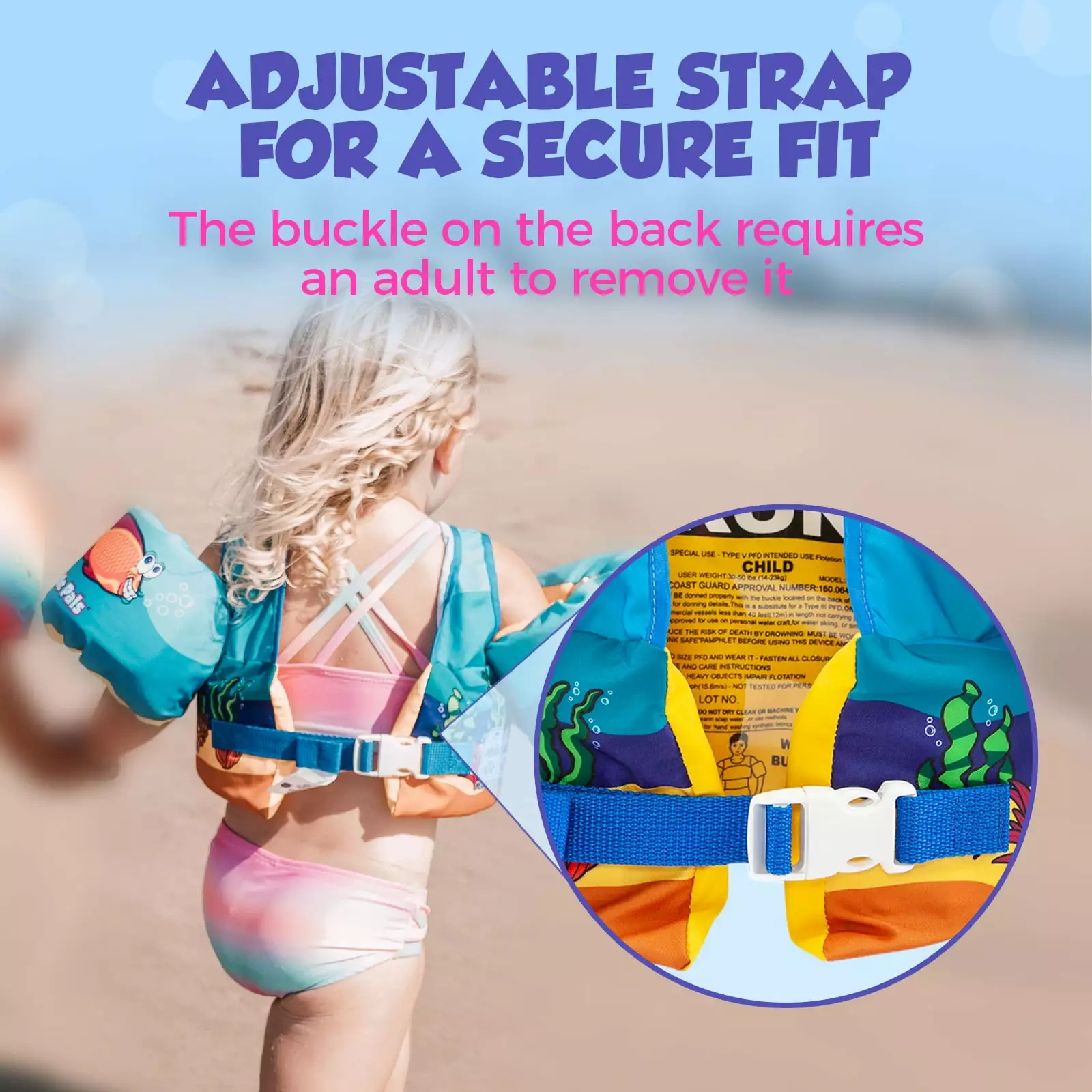 - BUCKLED STRAP – Ensures the vest remains securely fastened. preventing children from removing it without parental assistance. and providing an added level of safety and security.