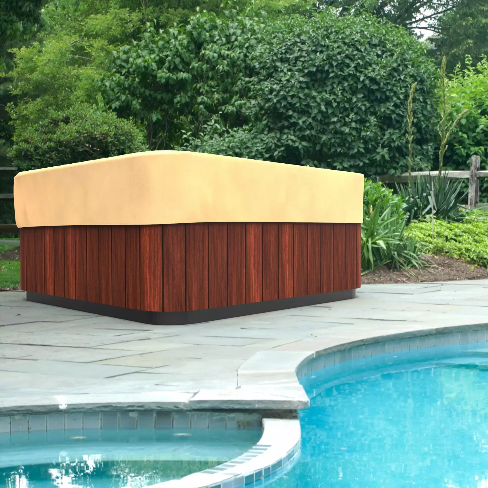 The Budge All-Seasons Square Hot Tub Cover. Large provides high quality protection to your outdoor hot tub spa / jacuzzi. The All-Seasons Collection by Budge Industries combines a simplistic design with strong outdoor protection. Available in a neutral beige nutmeg color. this patio collection will cover and protect your hot tub. Our All-Seasons collection is made from a 3 layer material that is both waterproof and UV resistant. keeping your hot tub from the elements. The outer layers are made from polypropylene. while the interior layer is made from a microporous waterproof material that is breathable. This allows trapped condensation to flow through. A full elastic hem helps keep the hot tub cover secure during windy days. With our All-Seasons Collection you’ll never have to sacrifice style for protection. This collection will complement nearly any patio decor. while extending the life of your outdoor grill. This hot tub cover measures 14" High x 94" Wide x 94" Long.