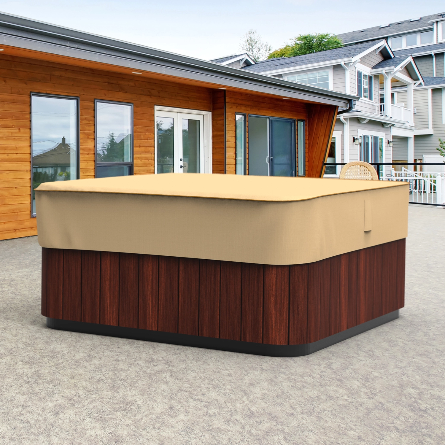 Our Square Hot Tub Cover. Medium provides protection for your outdoor patio furniture. Styled to complement your patio decor. this collection by Budge Industries comes in an attractive sandy-tan beige color and has contoured shapes that cover your patio furniture. The StormBlock Savanna collection combines the durability of our machine-woven 600 denier polyester with StormBlock technology and UV protection. With this technology. water rolls right off this cover. taking mud. tree-sap. dirt and bird droppings with it. Convenient zipper opening allows you easy access to your firewood. Sewn-in straps to help secure the cover to your furniture in windy conditions and custom air vents help to ensure adequate air flow to prevent condensation to reduce mold. mildew and rust. With our StormBlock Savanna Collection you’ll never have to sacrifice style for protection. This collection will complement nearly any patio decor. while extending the life of your outdoor furniture. Includes a 7-year warranty. This cover measures: 86" L x 86" W x 14" H.