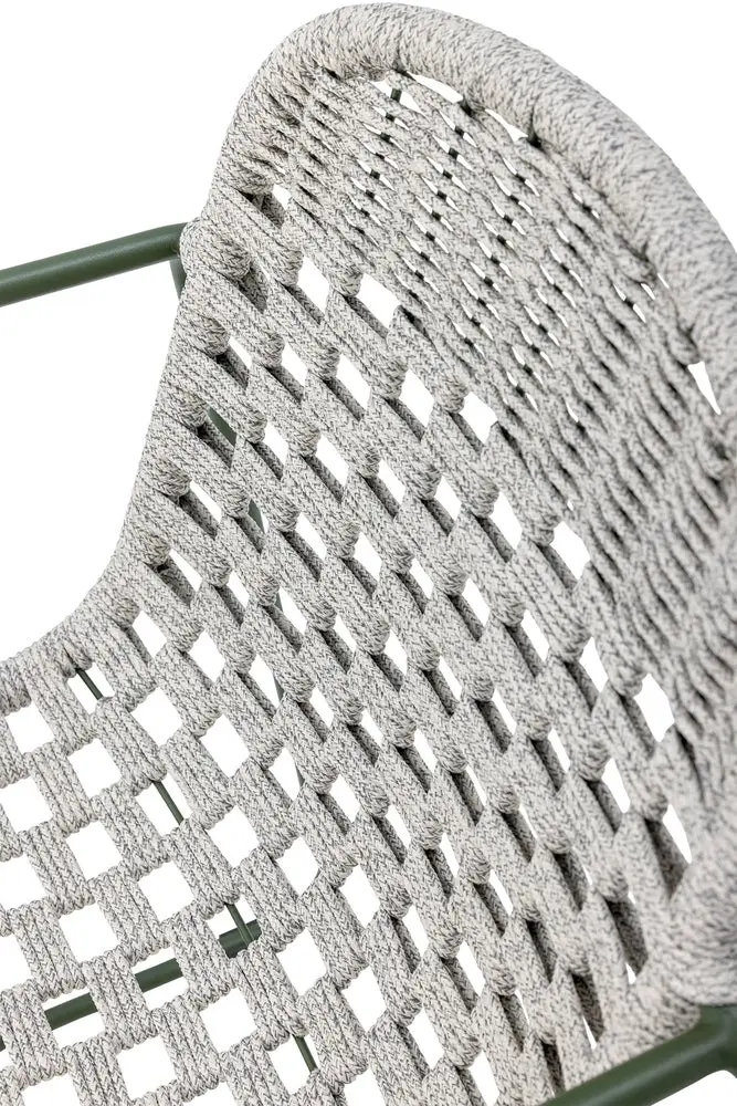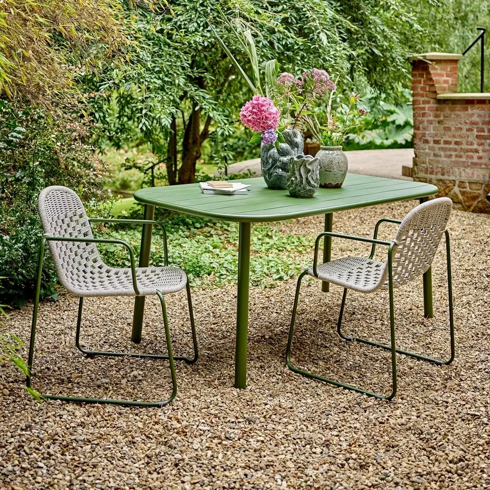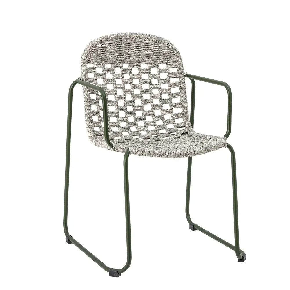 The Calana Dining chair by Bloomingville is designed for outdoor use, combining green steel legs with a woven grey seat. With its rounded back and curved armrests, the chair has a calm and elegant look. It is stackable for easy storage. We recommend placing outdoor furniture in covered areas.