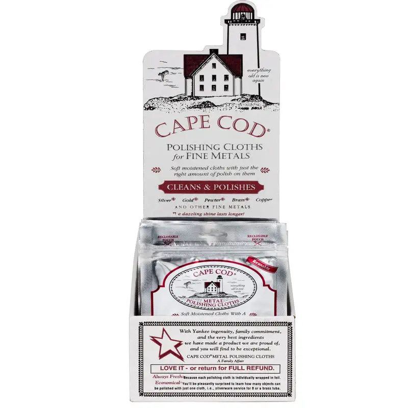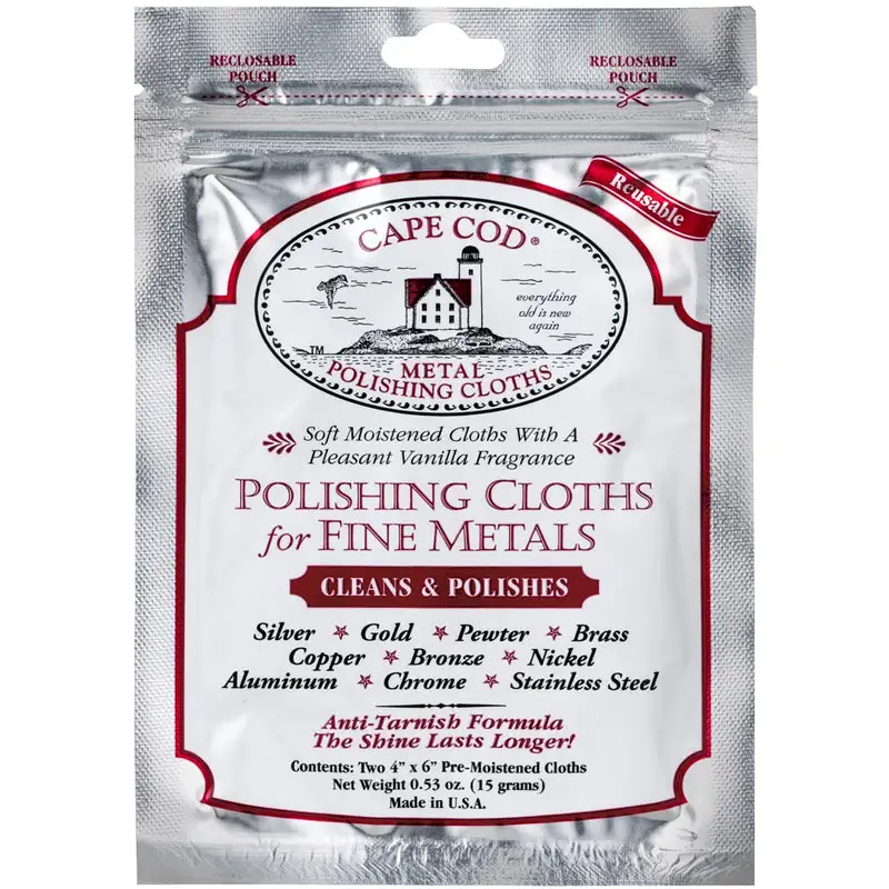 Cape Cod Polishing Cloths are superior polish for silver. gold. brass. copper. nickel. pewter. aluminum and stainless steel. The polish in these cotton cloths clean the toughest jobs. polish to a mirror shine and protect with an anti-tarnishing formula which significantly stretches the time between polishes. This foil pouch includes 2 moist cloths in a handy resealable pouch. Proudly made on Cape Cod.
