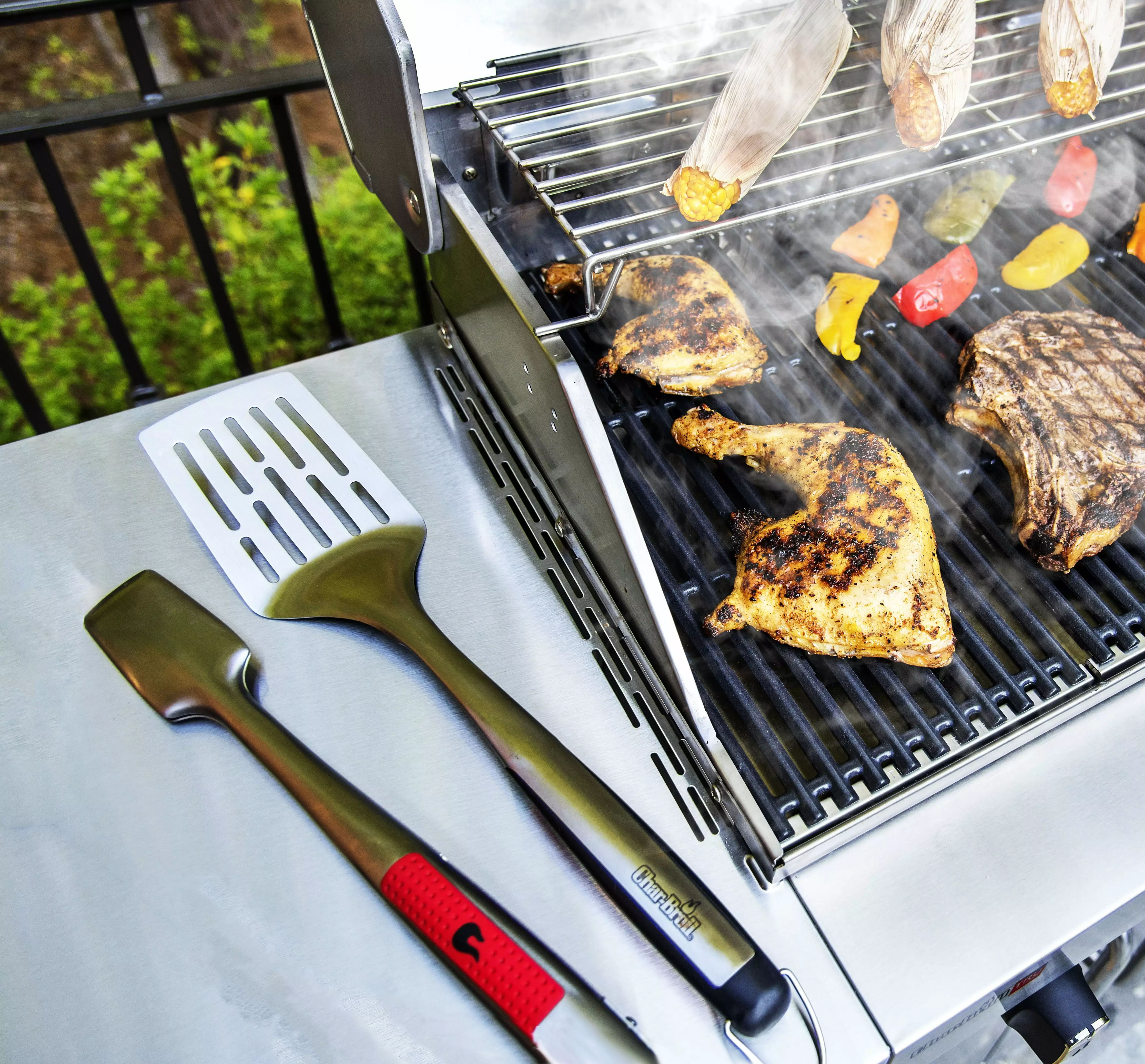 Every griller needs a spatula. Our Comfort-Grip Spatula is designed with a long handle to keep you out of the heat. Plus. the comfort grip design makes it easy to hold on to your favorite food. Our grilling spatula has a slotted head. which helps drain juices and fats from your food. A perfect tool for a perfect feast.
