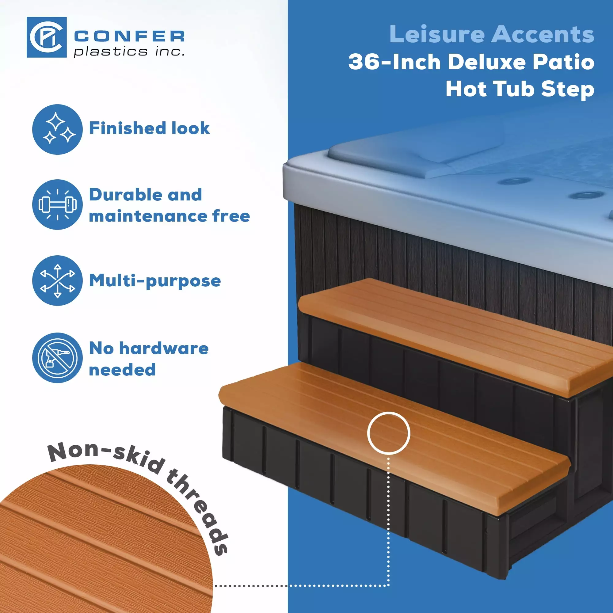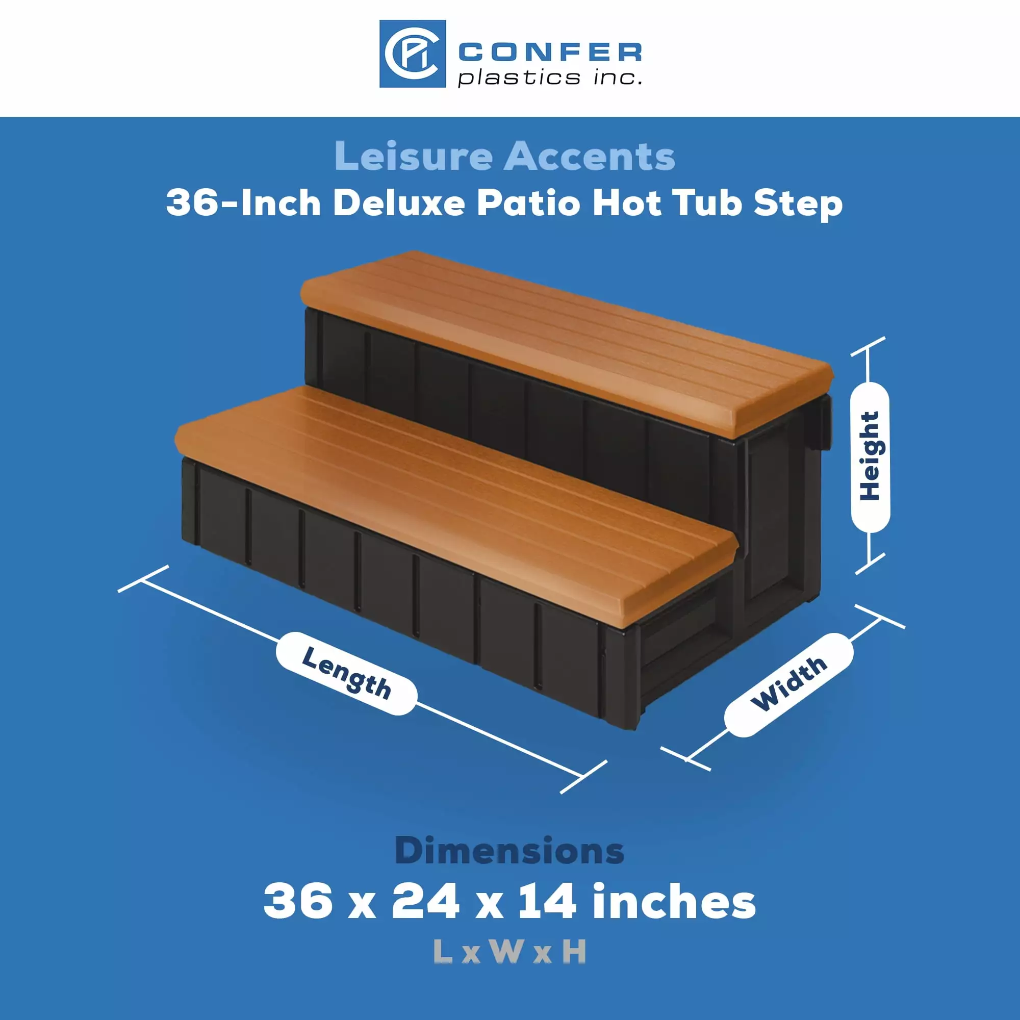 When it’s time to relax and get cozy in your spa. ease into your hot tub happy place with the Confer Leisure Accents 36-Inch Deluxe Spa Steps. This 2 step spa step from Confer Plastics was created with durability. style. and versatility in mind. Simply snap the pieces together. and you’re ready to go. Absolutely no hardware is needed! The hot tub steps allow for easy entry into spas. so you’ll always have security when entering and exiting. The design features 36-inch wide and 24-inch deep stairs. with non-slip treads that provide stability when getting in or out of your hot tub. Plus. the extremely durable blow-molded plastic construction supports up to 300 pounds and resists fading and cracking to ensure lasting use. The spa stairs can be used as a handy indoor and outdoor step stool. too! Use the steps in your garage or home. take them along on your camping trip for RV stairs. or use them outside for porch steps. The possibilities are endless. With the finished look and stylish 2-tone color. you can rest assured the step stool will add a splash of color and coordinate well with any color scheme so you don’t have to re-design your environment or decor theme. Whether you’re ready to enjoy a spa day. or you need a boost reaching a high shelf. the Confer Leisure Accents Deluxe Spa Steps provide a reliable solution to give you a leg up.