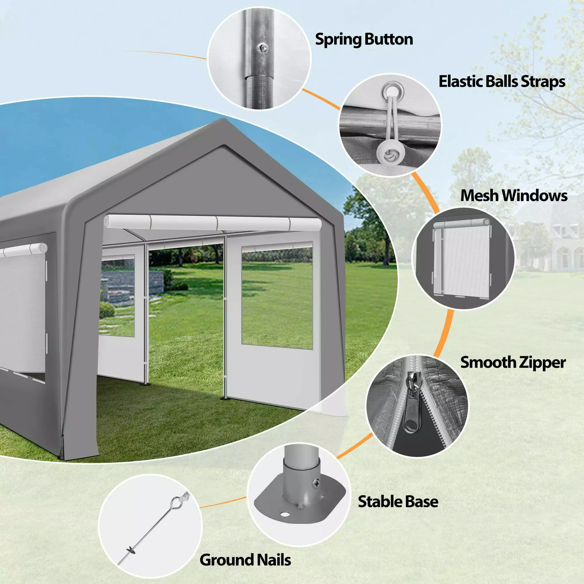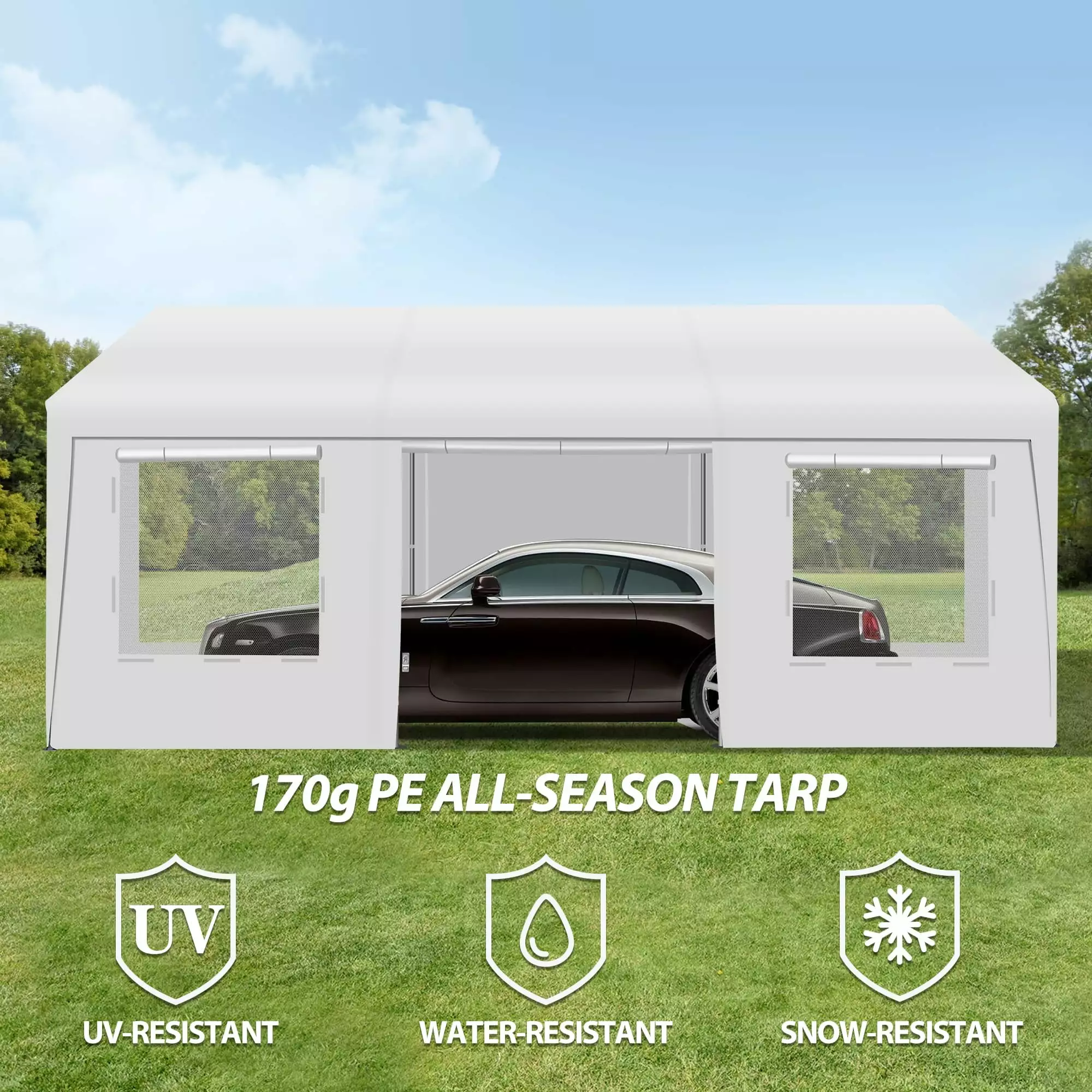 The COVERONICS 10 x 20 ft heavy duty extra carport with roll-up ventilation windows & removable sidewalls & doors gives you extra room and more storage space. This carport kit is also built with higher gauge steel than most carports. That means it is heavier and will stand up to the wind and weather elements better than other carports. It has 8 sturdy wide 1.5 inch diameter poles that provide more stability. The heavy-duty bungee cords tightly secure the tarp cover to the frame. Foot pads are installed to the canopy legs for added stability and easy access to secure anchor points. The Patio carport is a best choice for your cars and outdoor equipment as a garage. 1 or 2 adult can install this portable car tent within an hour effortless
