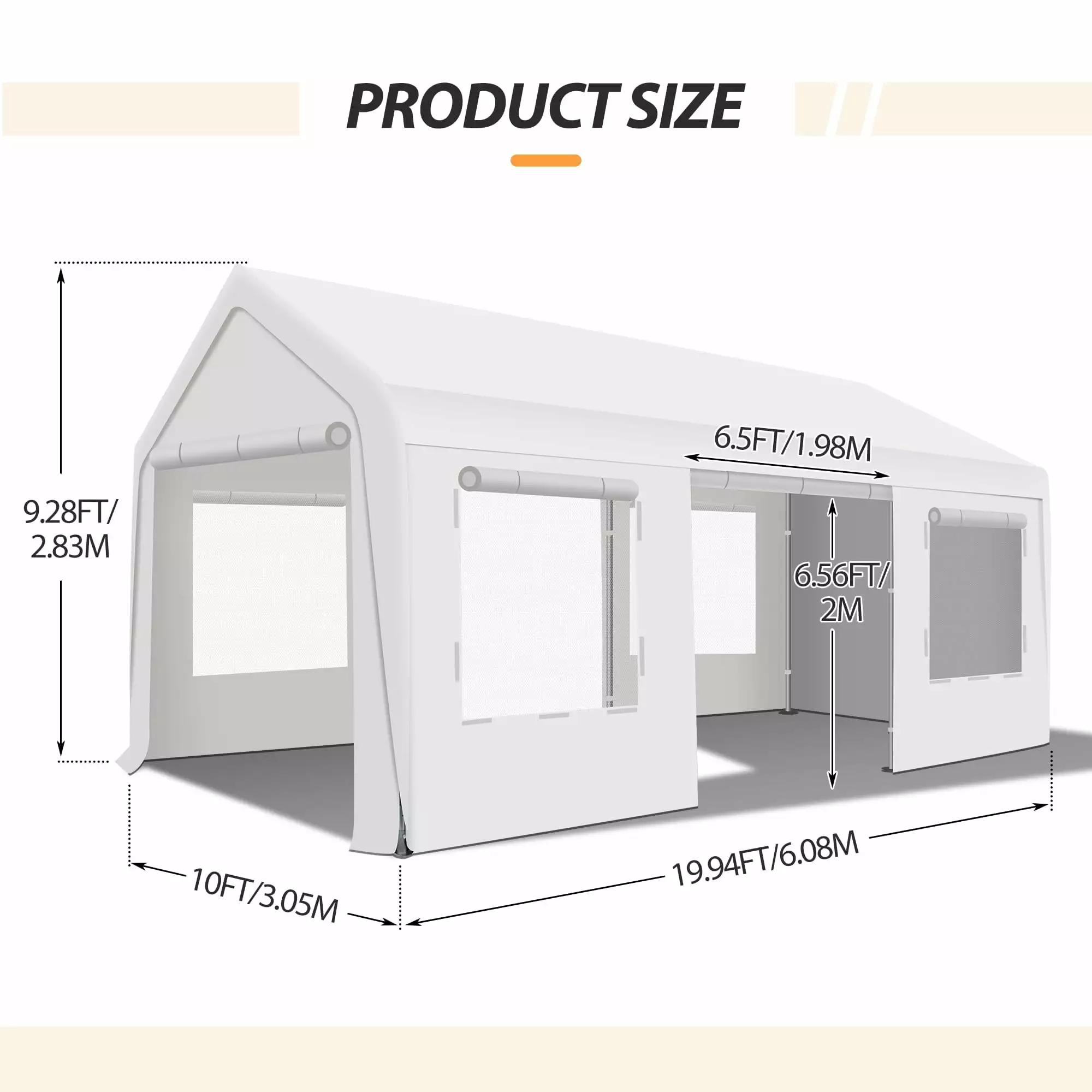 - EXTRA LARGE SIZE: Our party tent has four different sizes for you. SIZE: 13.12FT*26.24FT*9.84FT. 19.68FT*39.37FT*10.5FT. 13.12FT*19.68FT*10.17FT and 19.68FT*19.68FT*10.17FT. The wedding canopy tent can hold up to an estimated 50 people for dining or party. Please do not use in adverse weather conditions and remove snow promptly.