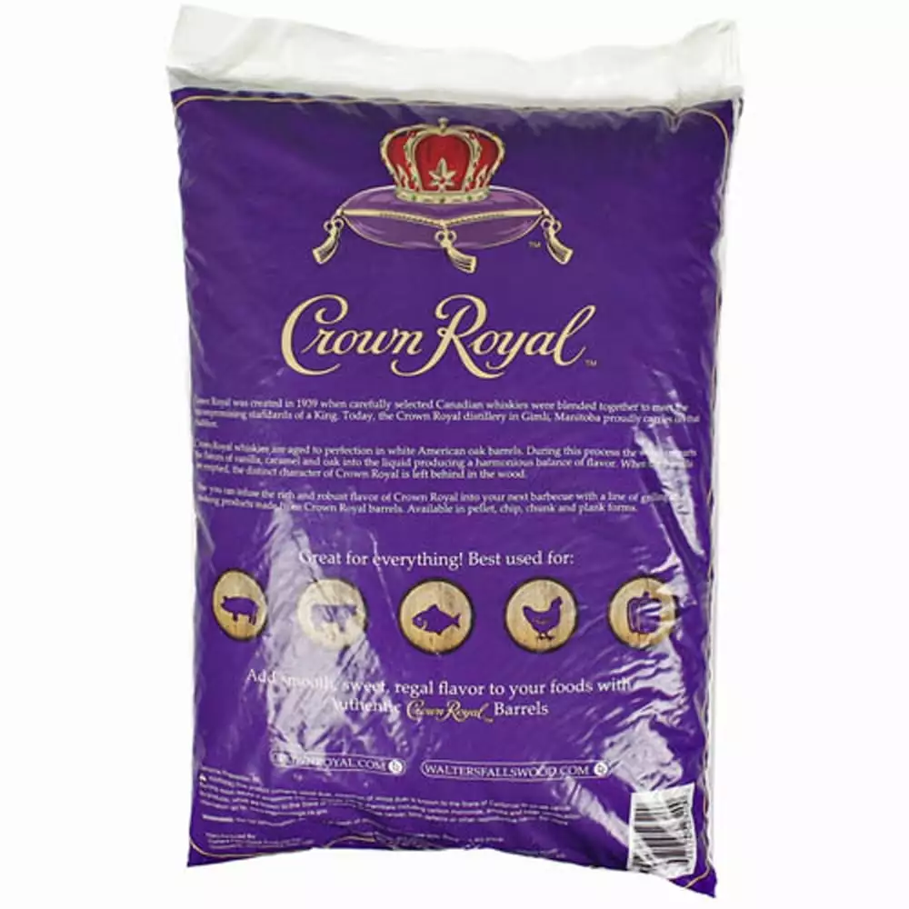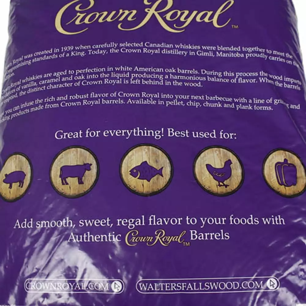 Crown Royal Premium Whisky Barrel Pellets CR-PELLETS Aged to perfection in white American oak barrels. Crown Royal whiskies are ones to keep close by. During this process. the wood imparts the flavor of vanilla. caramel. and oak into liquid. producing a harmonious balance of flavor. When the barrels are emptied. the distinct of Crown Royal is left behind in the wood. Now you can infuse the rich and robust flavor of Crown Royal into your next barbeque. Features Pellets from authentic Crown Royal whisky barrels No additives! Just 100% wood from retired whisky barrels. Gives food distinct vanilla. caramel. white oak flavor. Great for all meats. cheese. and vegetables. Easy to follow instructions on the packaging. Perfect for charcoal. gas barbecue. or smoker barbecue.