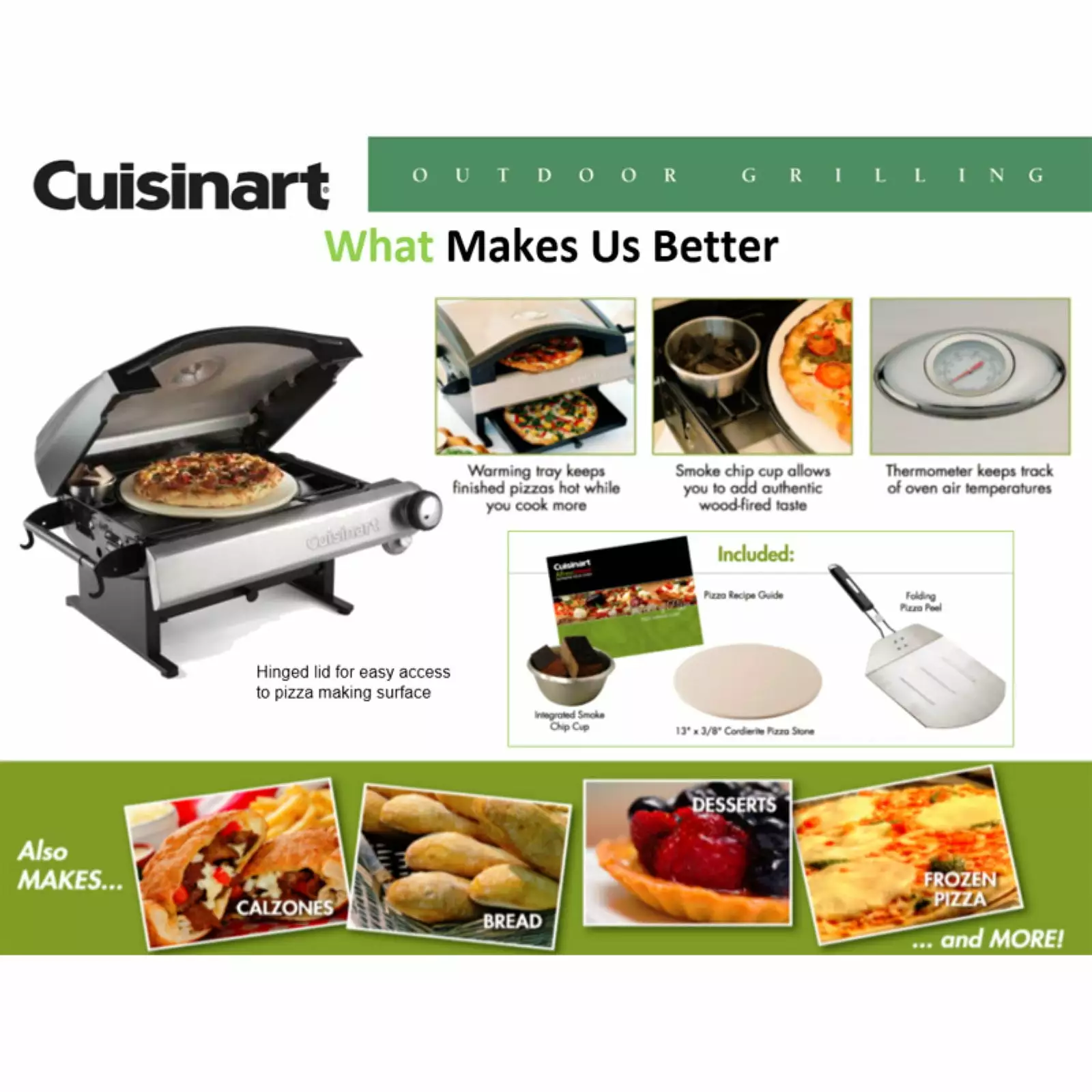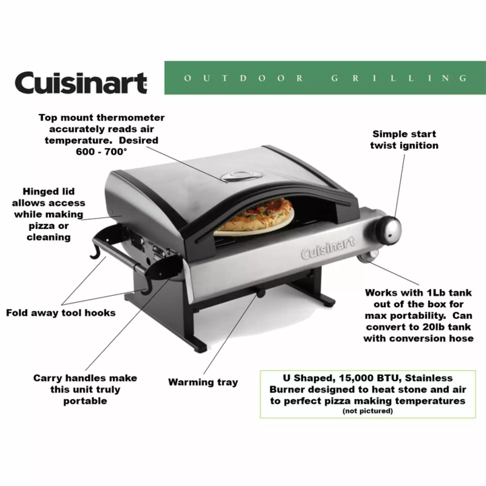 Alfrescamore means for the love of the outside and after adding one of these outdoor pizza ovens to your patio you may never want to cook inside again! The Cuisinart CPO-600 Alfrescamore Gas Powered Portable Outdoor Pizza Oven was born from our love of crisp. brick oven style pizza. It’s been designed with the cooking ability of professional brick ovens. but with the accessibility. ease. and size of a portable grill. The compact design and built-in handles make this oven even more portable. Whether you’re holding an impromptu family pizza night. inviting the friends over for a patio pizza party. or showing off at the next tailgate. the Cuisinart CPO-600 Alfrescamore Gas Powered Portable Outdoor Pizza Oven will make you the master of outdoor cooking.